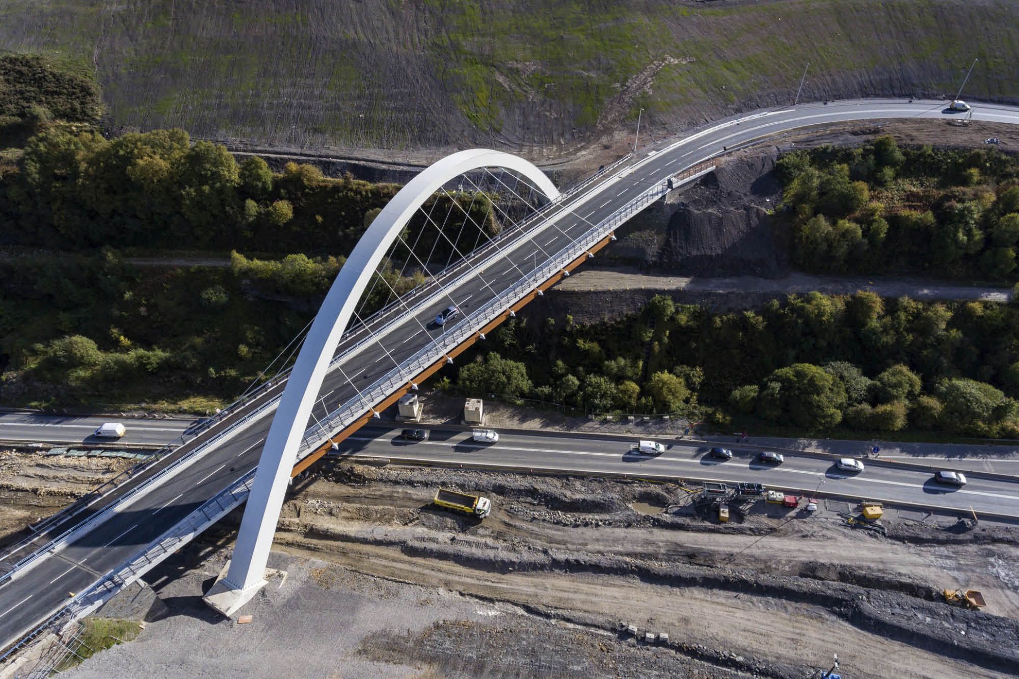 Stalen boogbrug torent boven Welsh landschap uit