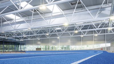 Tekst: The new elite sports hall in Louvain-la-Neuve, which serves not only as training infrastructure but also as a venue for courses and indoor competitions, is 80 m wide and 130 m long and has a floor area of approximately 10,000 m², spanned without internal support columns. The 540 tonne S355 steel supporting structure is made up of 80 m long and 14.6 m high transverse gantries and the outsides of the columns are v-shaped, reducing the number of support points and giving the structure a more ‘architectural’ silhouette. Three-dimensional trusses with a span of 80 m are incorporated in the roof. The roof structure comprises perforated sheet steel, rock wool insulation and a multi-layer waterproofing system. The facade dynamics envisaged by the architects were achieved by means of a secondary structure attached to the main structure that supports a perforated steel sheet on the inside, which in turn bears the acoustic rock wool insulation.