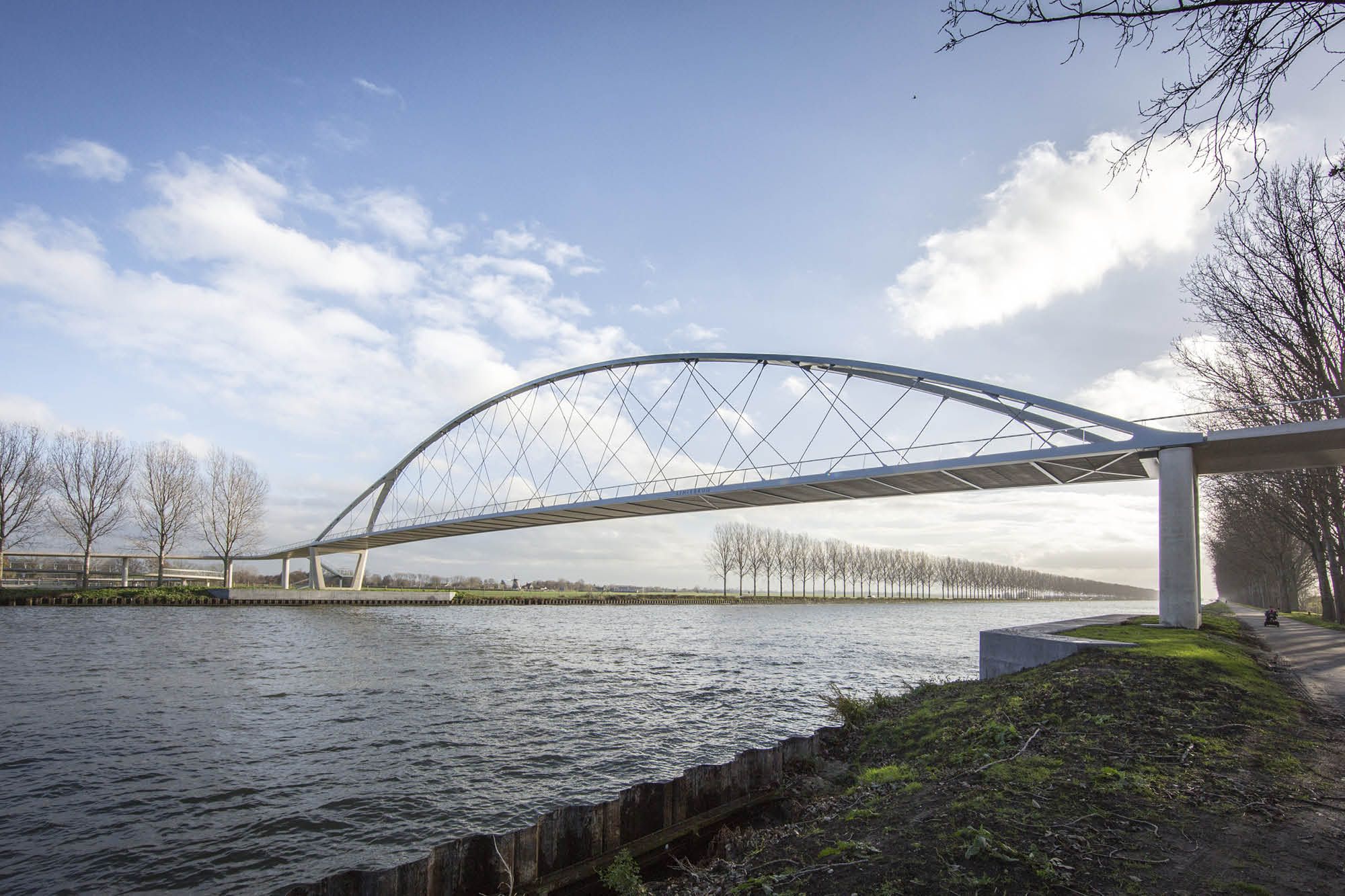 L’été de 2018 a vu la mise en service du pont en arc en acier le plus élancé des Pays-Bas à Nigtevecht. L’arc fourchu à treillis de 104 m de long pour cyclistes et piétons, enjambe le canal d’Amsterdam au Rhin avec une hauteur de passage sous tablier de 10 m. La hauteur de passage sous le pont exigée a fait de son implantation un véritable défi. En comptant les pentes et les passerelles d’approche, la longueur totale de l’ouvrage dépasse les 600 m. Grâce à une coopération précoce avec les résidents des environs et les parties prenantes, le processus s’est déroulé tout en souplesse.