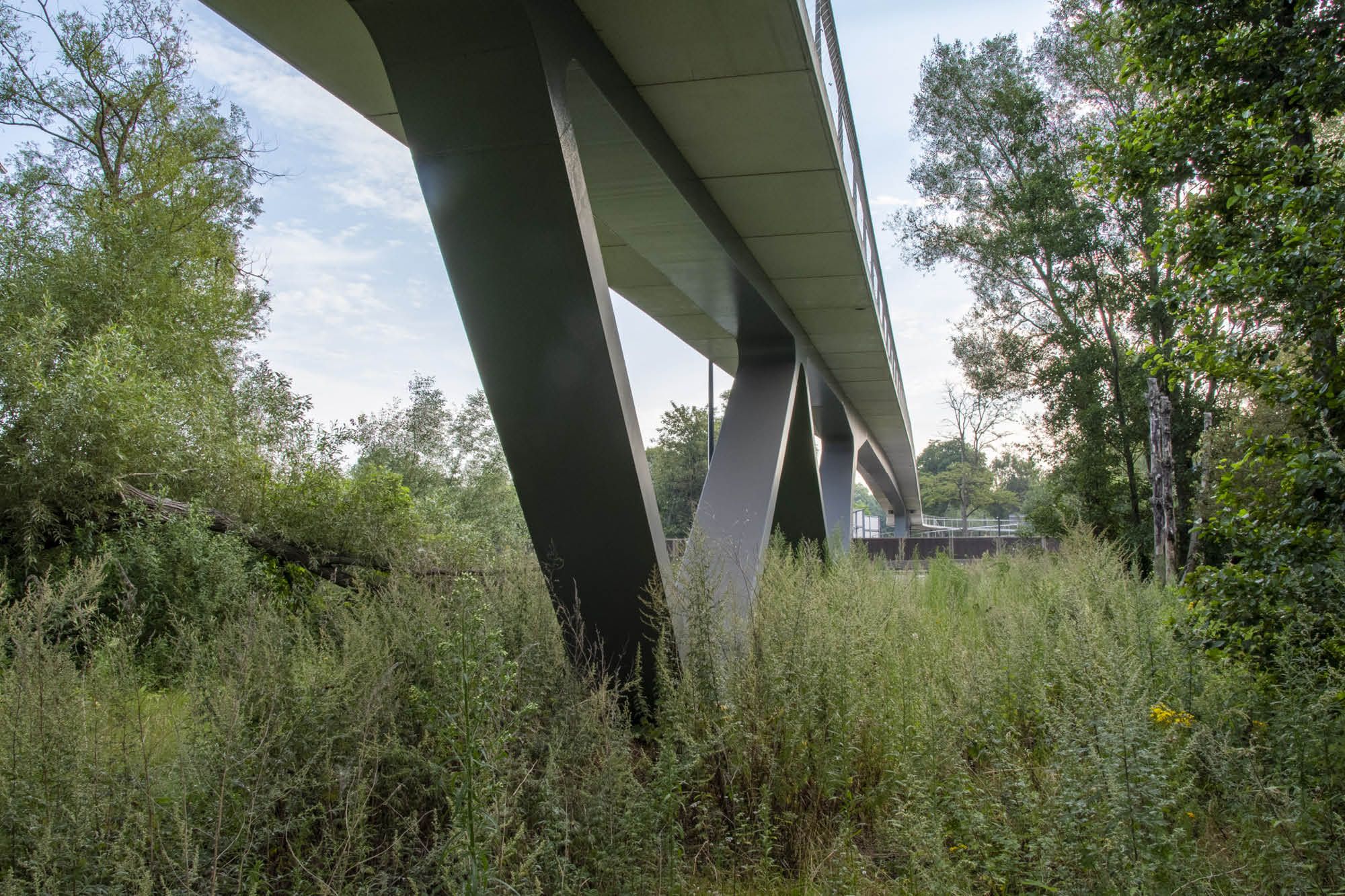 Une piste cyclable a été réalisée pour compléter le parcours de la voie rapide pour vélos F7 à Gand. Le nouveau tronçon franchit le Canal périphérique, le Ring 4 et l’E40. Afin de pouvoir couvrir de telles portées, le choix s’est orienté vers un ouvrage mixte acier-béton. D’une longueur de 136 m, la passerelle André Denys est constituée d’une poutre maîtresse en acier sur laquelle repose une dalle en béton armé, le tout supporté par des piles sur des fondations en pente sur les berges du canal. Le pont sur l’E40 (pont Zoé Borluut), d’une longueur de 138 m, est également une structure mixte acier-béton avec une poutre principale en acier de 1 m de large et une hauteur variable. Le point fixe de cette structure se trouve au niveau de la forme en W (quatre piliers inclinés continus).