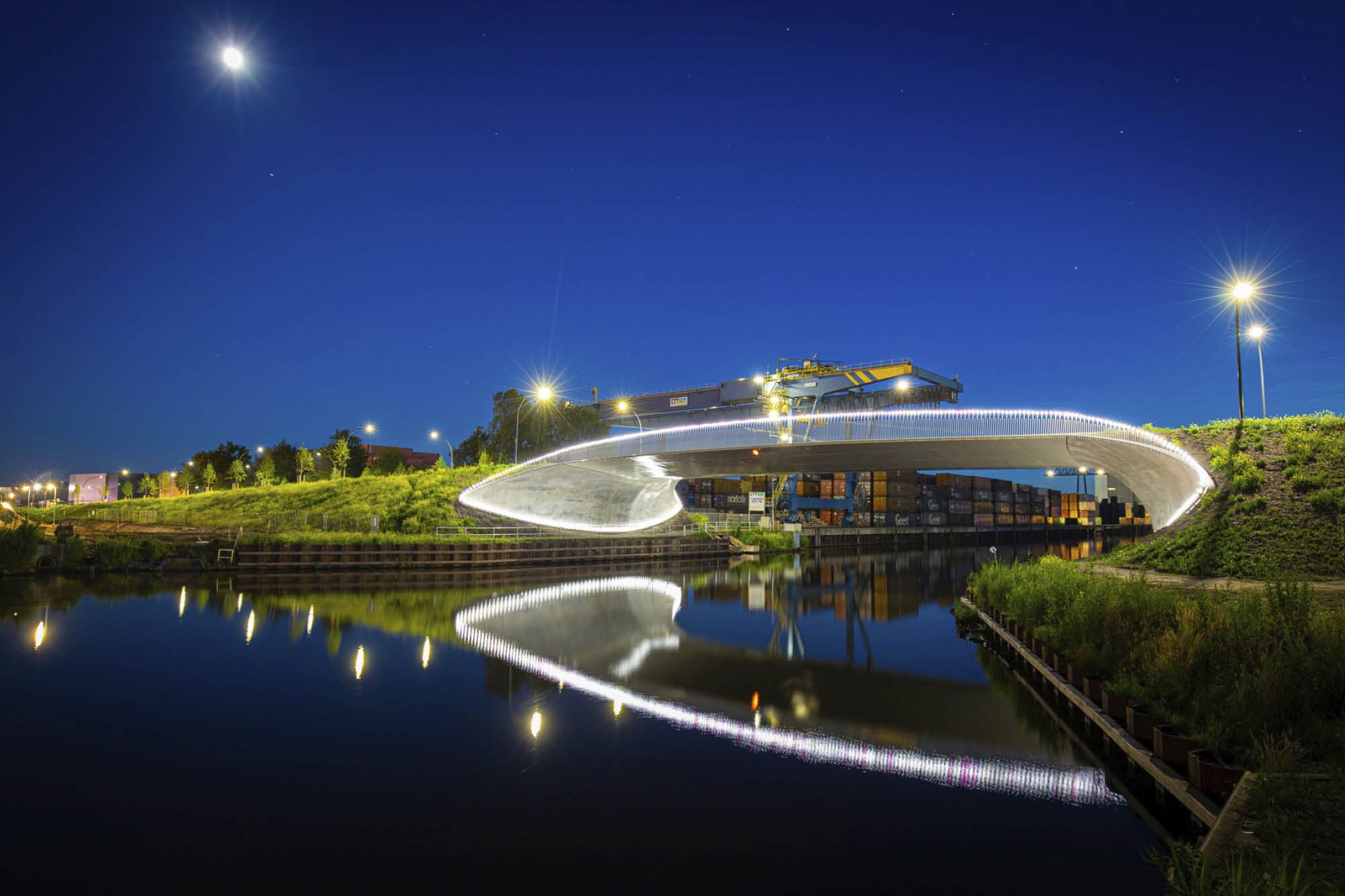 Le nouveau pont Boekelose sur le canal de Twente est un composant de la liaison entre le centre de Hengelo et l’autoroute A35. Les clients voulaient encourager les entrepreneurs en faisant de l’innovation un facteur important dans l’évaluation des offres. En raison du temps de montage limité au-dessus du canal, le choix s’est porté sur un tablier de pont en acier. Le point de départ était un concept de pont avec plusieurs éléments intégrés dans une géométrie élancée et fluide. Le tablier en acier du pont se fond quasiment sans transition dans la géométrie des têtes de pont. Les deux sont intégralement connectés. Cette approche crée un nouveau type de pont, dans lequel la composition classique de tablier de pont, tête de pont, batardeaux et main courante est abandonnée. Le tablier du pont lui-même est constitué d’une coque incurvée en acier, rigidifiée en haut par deux poutres longitudinales et quelques renforts transversaux. La coque en acier est remplie de béton cellulaire.