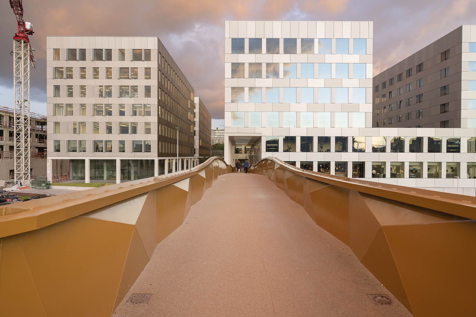 La passerelle piétonnière fait partie du nouveau complexe de bureaux de Post X. Elle relie la place intérieure du projet à la place de la gare de Berchem. Elle passe d’abord par la colonnade du centre de services – dont elle constitue simultanément l’entrée principale – pour ensuite enjamber le boulevard périphérique du Singel. Un pilier de soutènement en béton architectural a été installé à côté de la piste cyclable. Sur la place, le pont se transforme en un large escalier avec ascenseur annexe. La passerelle piétonnière de Post X fait au total 111 m de long et la travée la plus longue enjambe le boulevard périphérique intérieur sur 44 m. La largeur utile de la passerelle est de 3 m.