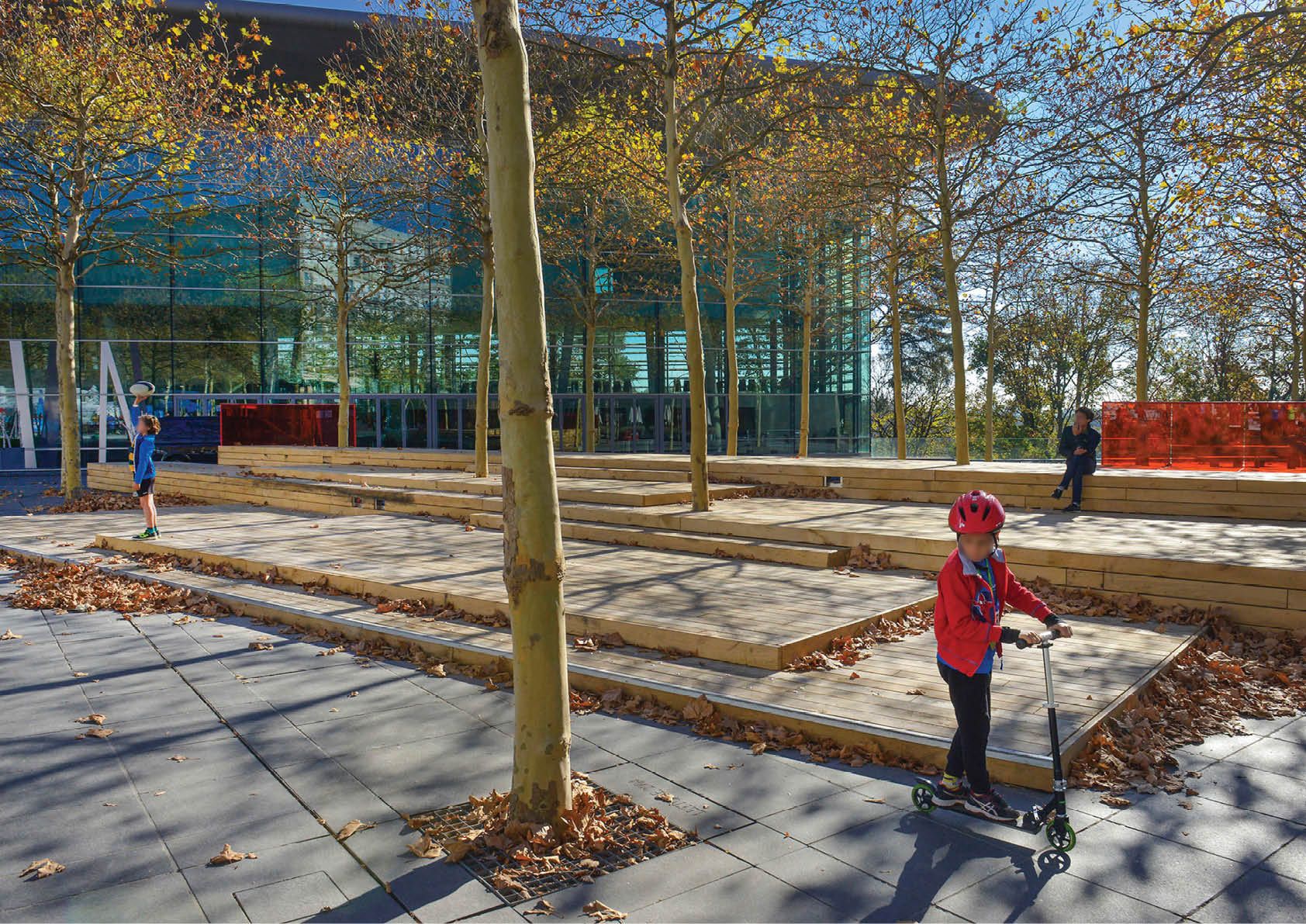 Afin de stimuler la convivialité sur la partie « sud » de la Place de l’Europe, deux plateformes en acier et en bois de chêne en forme d’éventail y offrent désormais un lieu où l’on peut se déplacer, se rencontrer, se reposer et s’attarder. Elles peuvent également accueillir diverses activités publiques. Un éclairage approprié suspendu à des câbles précontraints et fixés sur des colonnes circulaires a également été mis au point. Les plates-formes (75 t d’acier) et les six colonnes (8,5 t) pour l’installation lumineuse sont réalisées en profilés métalliques (S 235) et fabriquées en atelier. Si les deux plateformes ont été pourvues d’une galvanisation à chaud, les colonnes ont en plus obtenu une peinture anthracite. Afin de simplifier et d’uniformiser la structure en acier, qui ne contient presque aucun angle droit, les parties porteuses ont été réalisées exclusivement en profilés HE160A. L’ensemble des plateformes a été habillé avec un bardage en planches de chêne local.