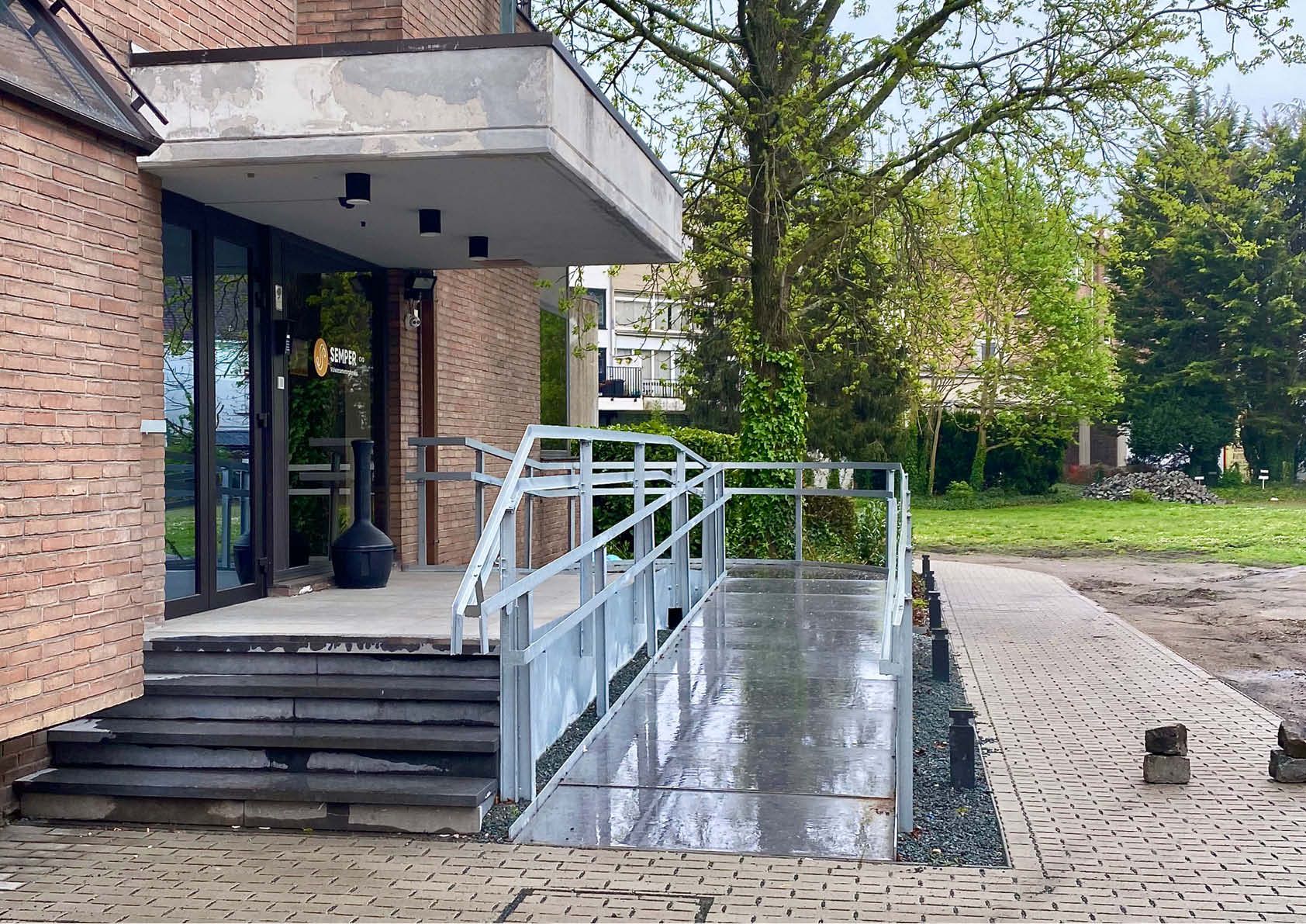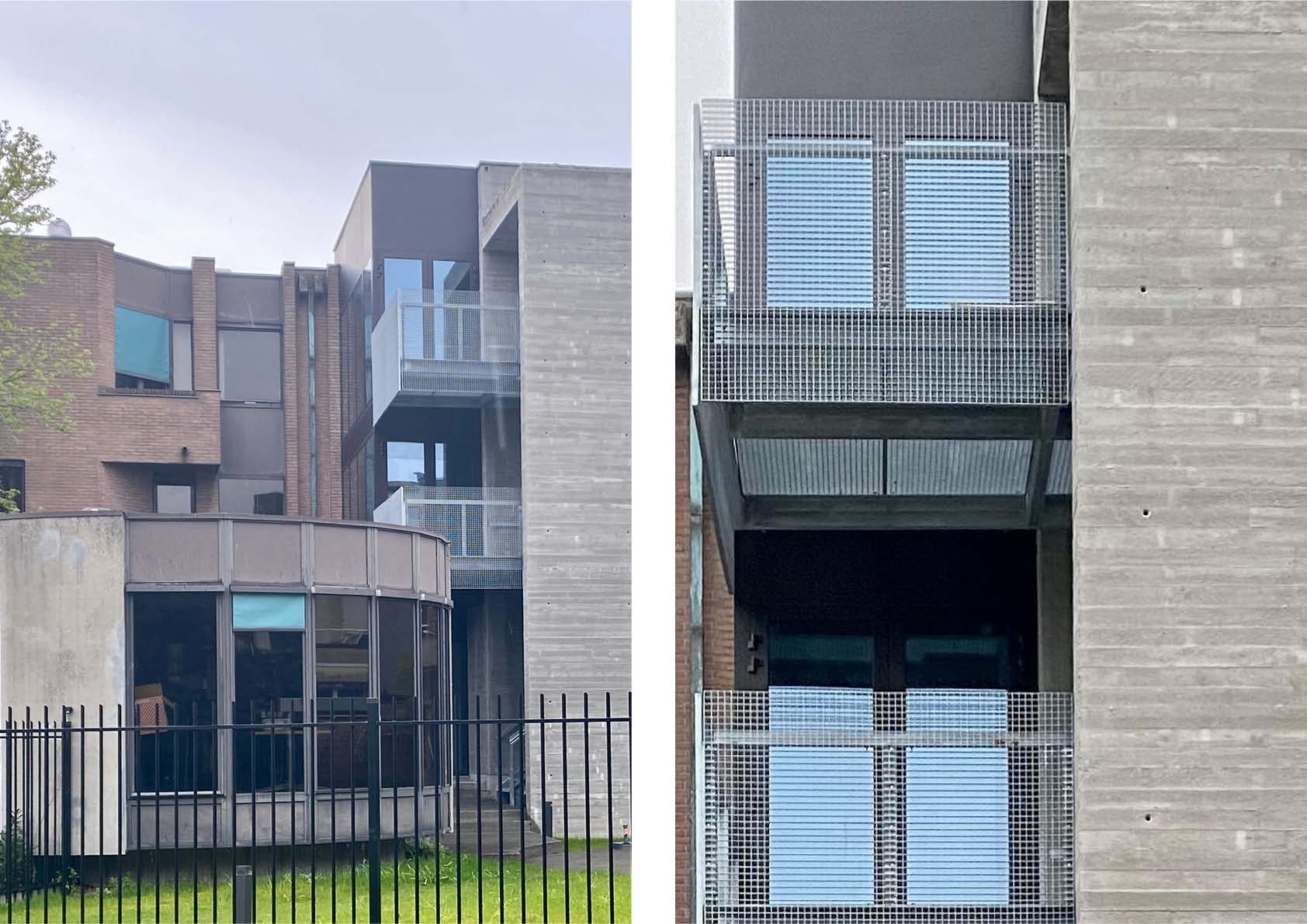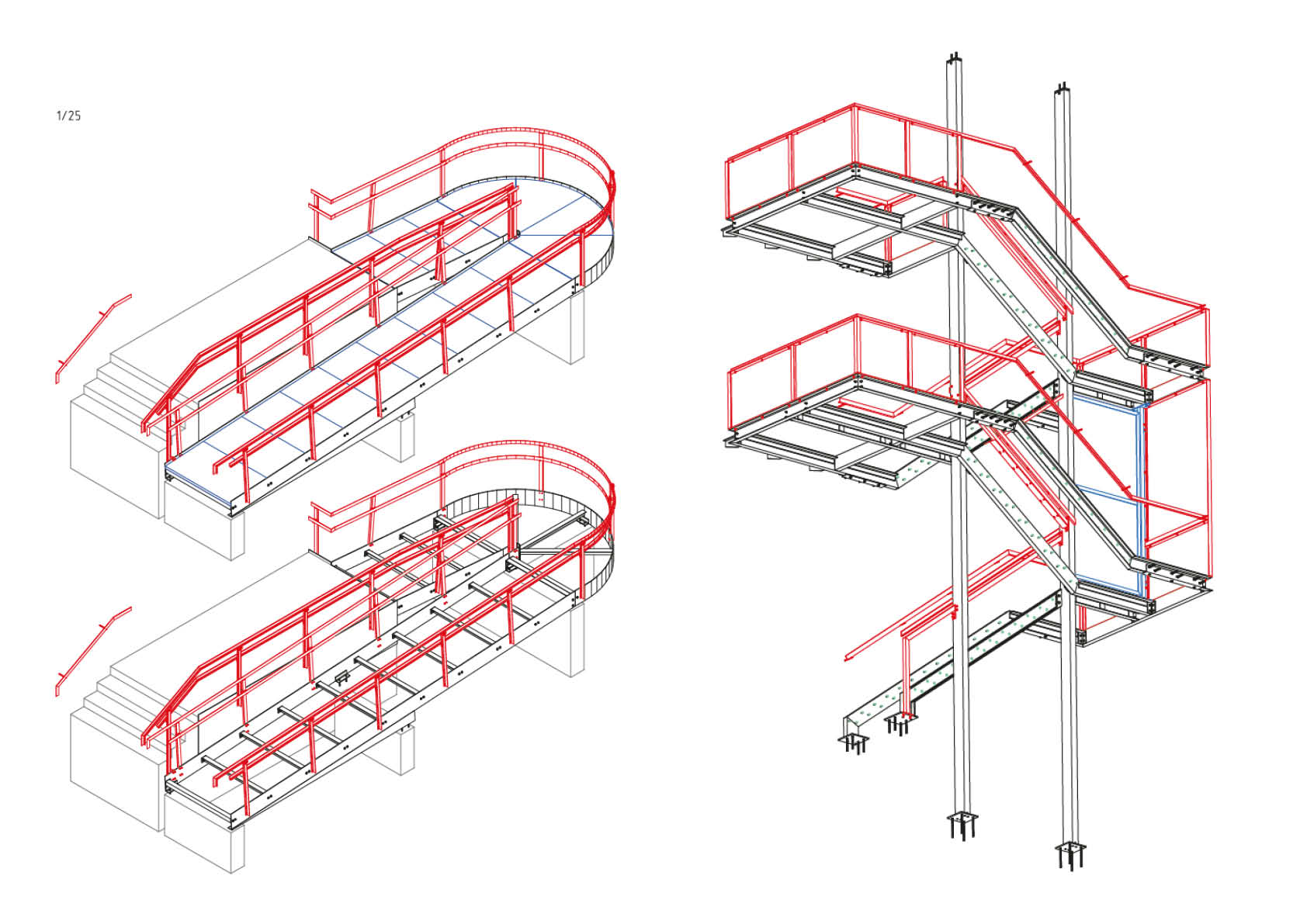 Ainsi, une nouvelle rampe en acier galvanisé a été conçue à l’entrée en plus d’un volume d’ascenseur dans les limites du bâtiment actuel. Un volume d’escalier de secours ouvert en béton apparent exposé et en acier galvanisé a été prévu à l’arrière du bâtiment. On retrouve également ce matériau dans la structure de suspension de la passerelle et dans les escaliers, les marches et garde-corps, dont les lames de planchers sont complétées par une grille à mailles fines.