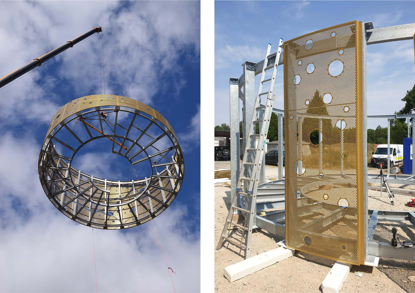 Concrètement, la structure a été assemblée en premier lieu. On y a ensuite posé les cassettes en aluminium du bardage, dans un ordre bien précis. Il a ensuite fallu réaliser les structures des différents plateaux au sol, avant de les imbriquer dans la structure.