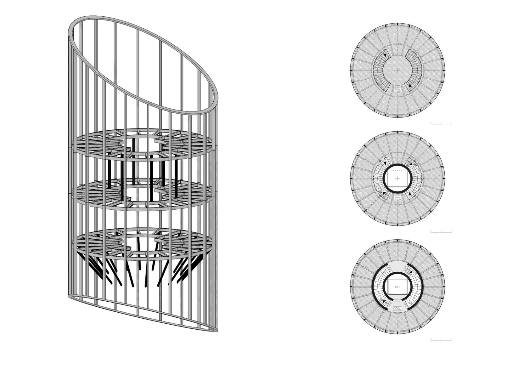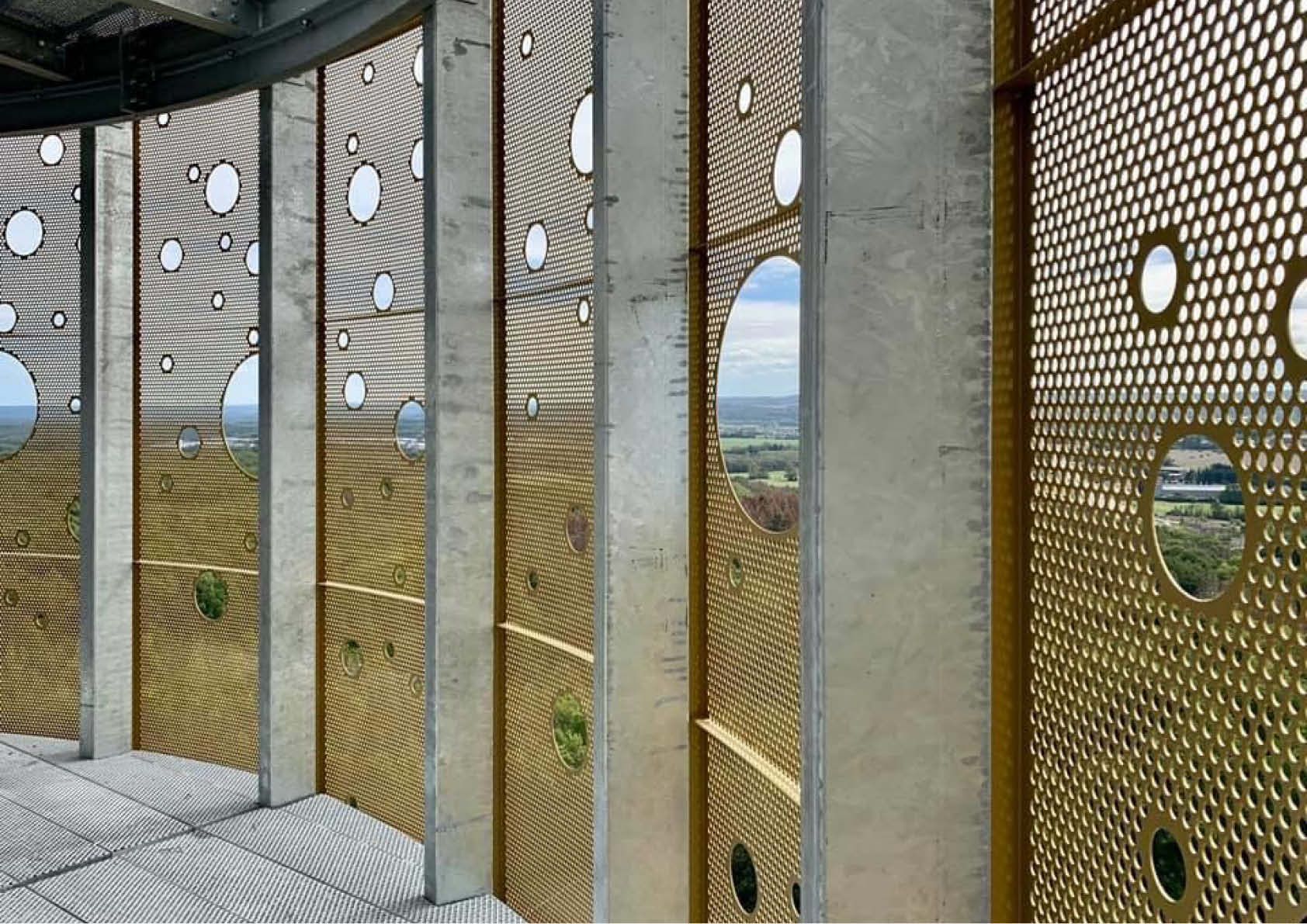 La coiffe est composée de 2 parties distinctes : la structure de bardage et les planchers, en acier galvanisé S235JR, et les bardages eux-mêmes, composés de 21 différents modèles de cassettes en tôles d’aluminium perforées EN AW 5005. Ces derniers fonctionnent à la fois comme une double peau, ce qui offre une transparence générale, ainsi que comme garde-corps, une mesure de sécurité nécessaire.