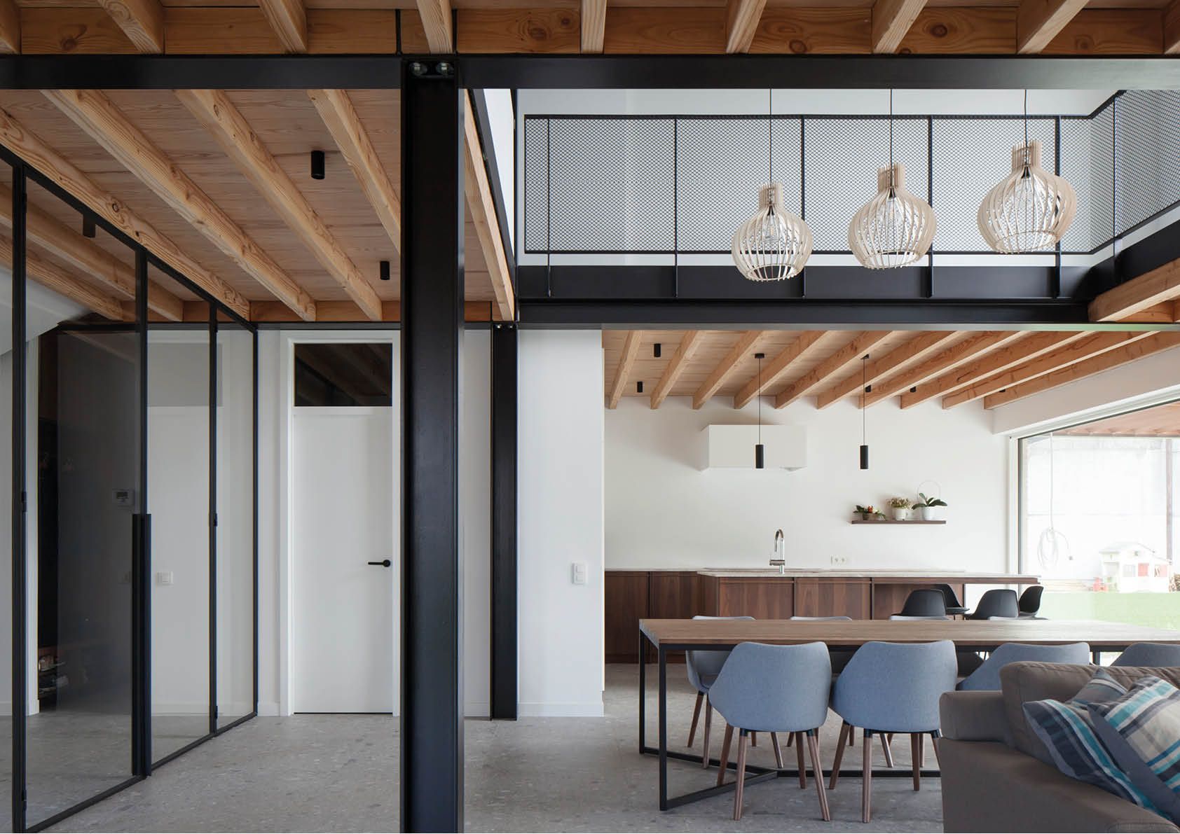 En travaillant avec un plan ouvert et un vide en double hauteur, l’étage et le rez-de-chaussée sont reliés visuellement. Un plan ouvert, organisé par la grille de colonnes en acier, laisse libre cours à l’interprétation. De grandes fenêtres à l’arrière permettent de communiquer avec le grand jardin. Le bois huilé transparent des plafonds contraste avec les balustrades et la structure en acier peinte de couleur sombre pour éviter toute connotation industrielle excessive. Ces balustrades sont constituées de cadres en acier complétés de matériau expansé.