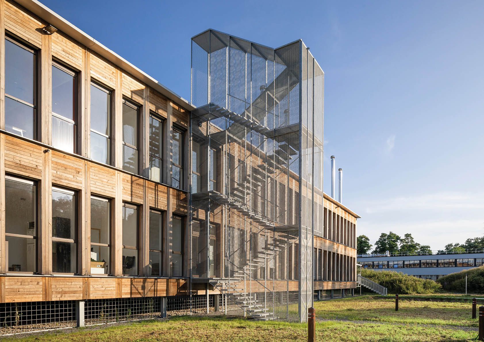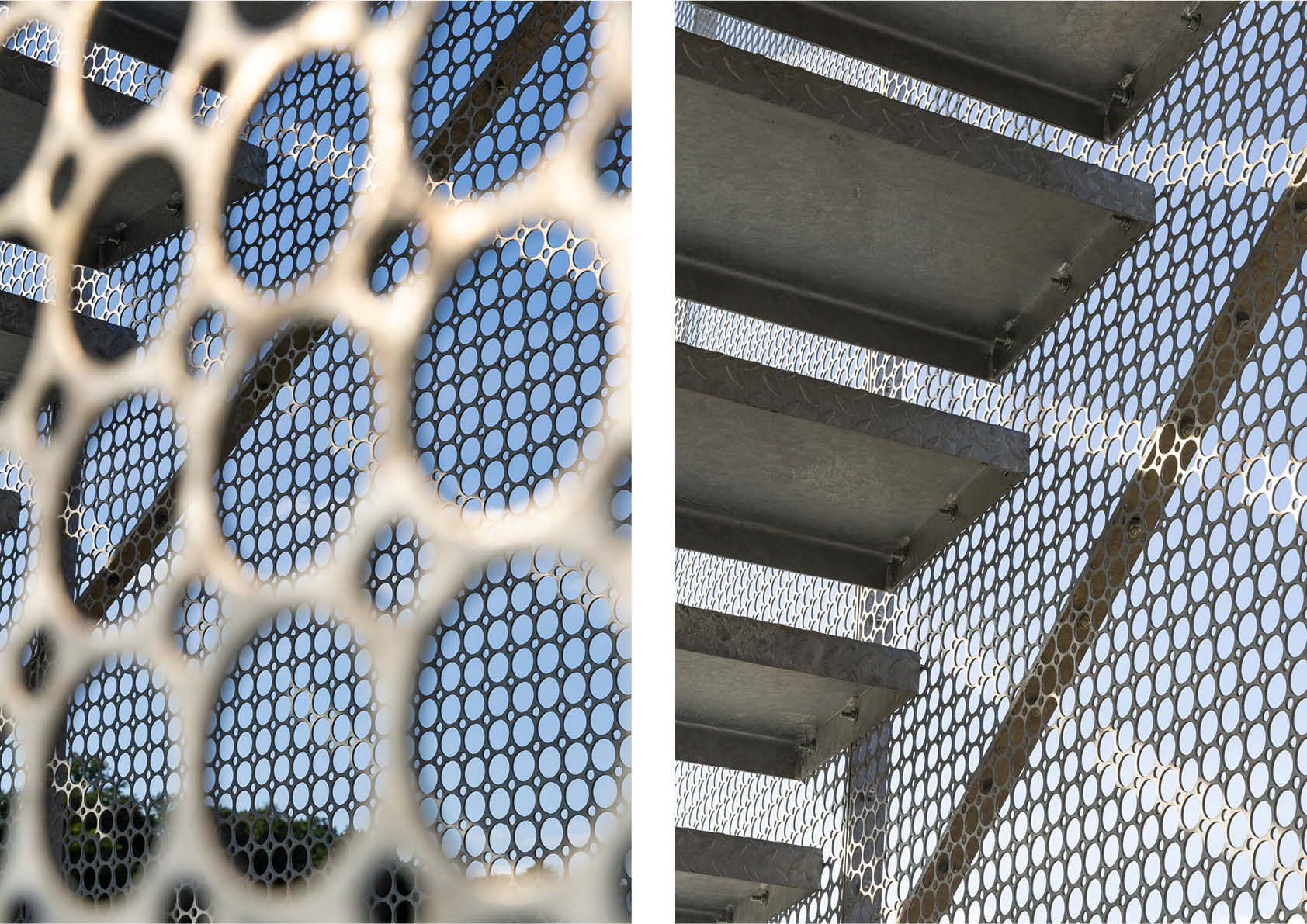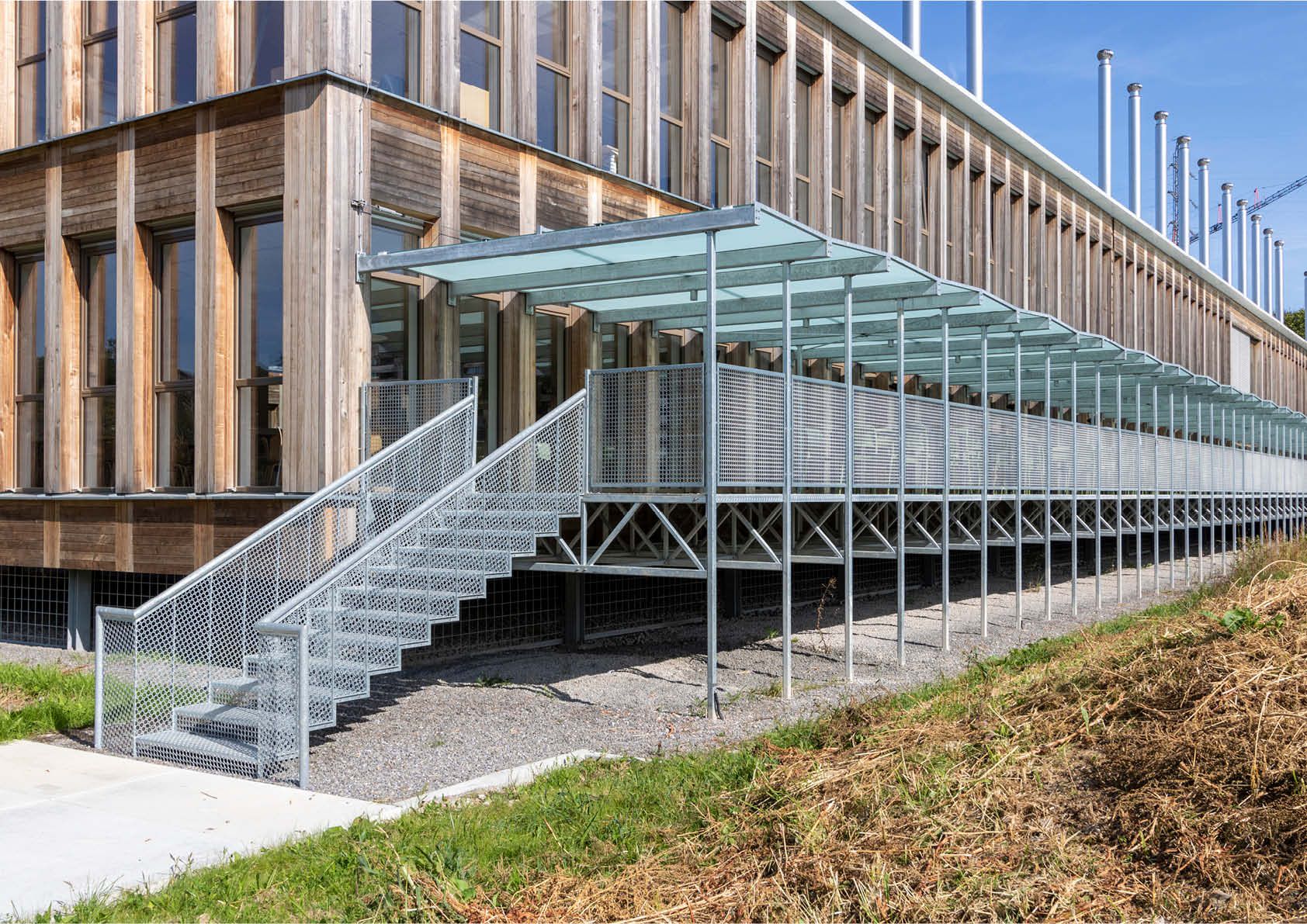 L’acier se retrouve également dans plusieurs éléments greffés au bâtiment, notamment la large coursive en panneaux de tôle larmée et l'auvent vitré qui la couvre tout le long de la façade principale. On peut également pointer l’ascenseur et la passerelle extérieurs, constitués de sous-ensembles soudés faits de profilés laminés (L, T et HEA) et galvanisés à chaud par trempage. La tour et l’escalier de secours sont habillés par des panneaux en tôle perforée Magnelis® qui contribuent à une grande transparence.