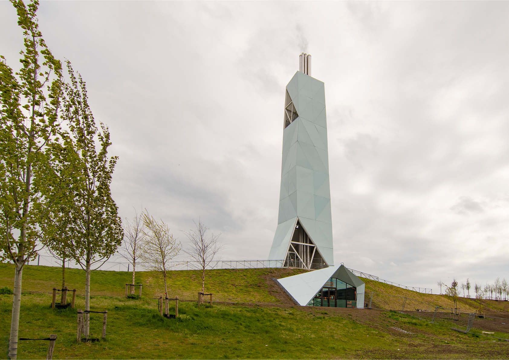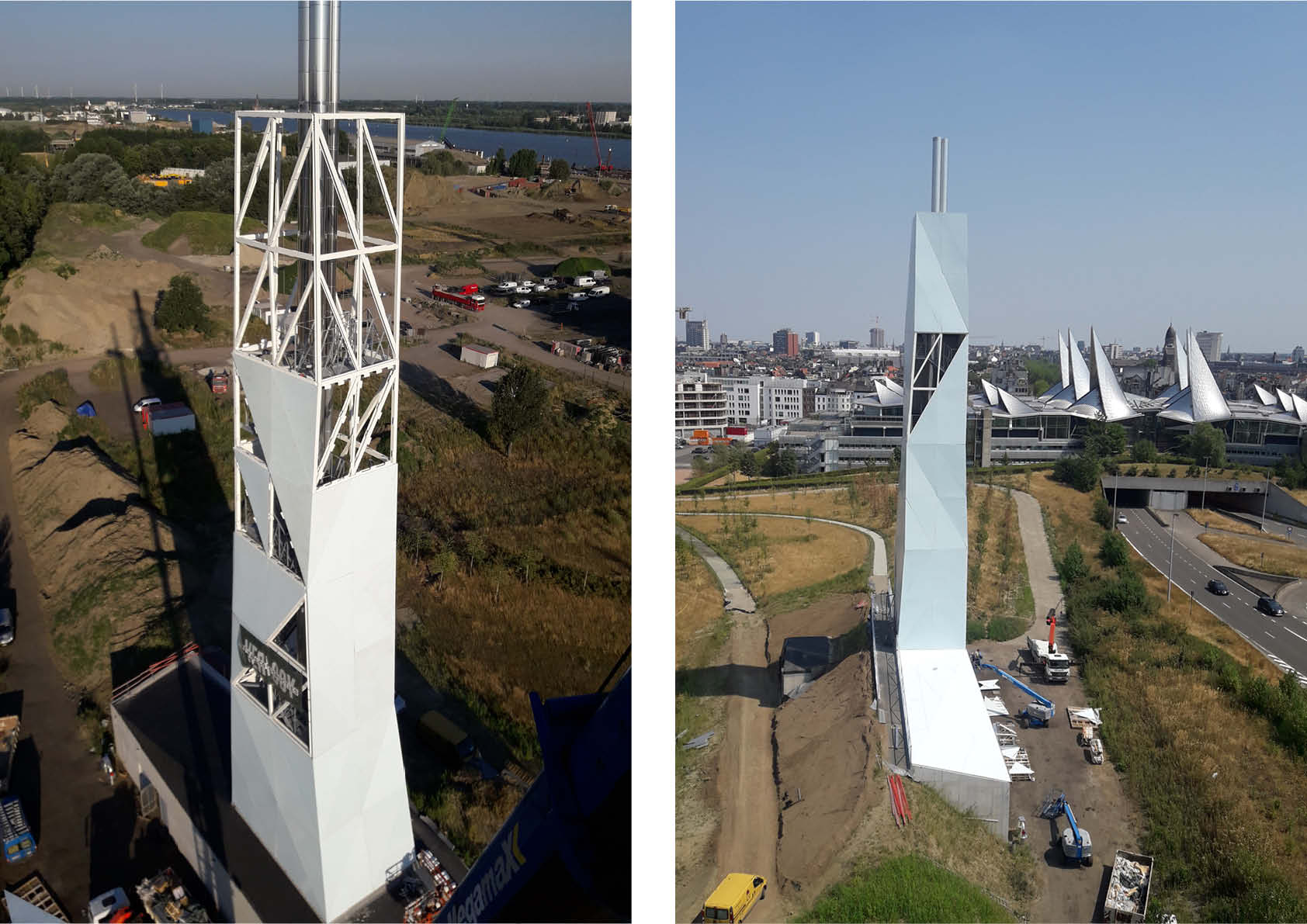 Une tour élancée de 50 m de haut, est le fleuron du projet de logements durables que la ville d’Anvers développe dans le cadre des objectifs climatiques 2050 au sud des quais de l’Escaut. Elle forme la pierre de voûte visible du réseau de chauffage, qui doit fournir la chaleur à l’ensemble du quartier.