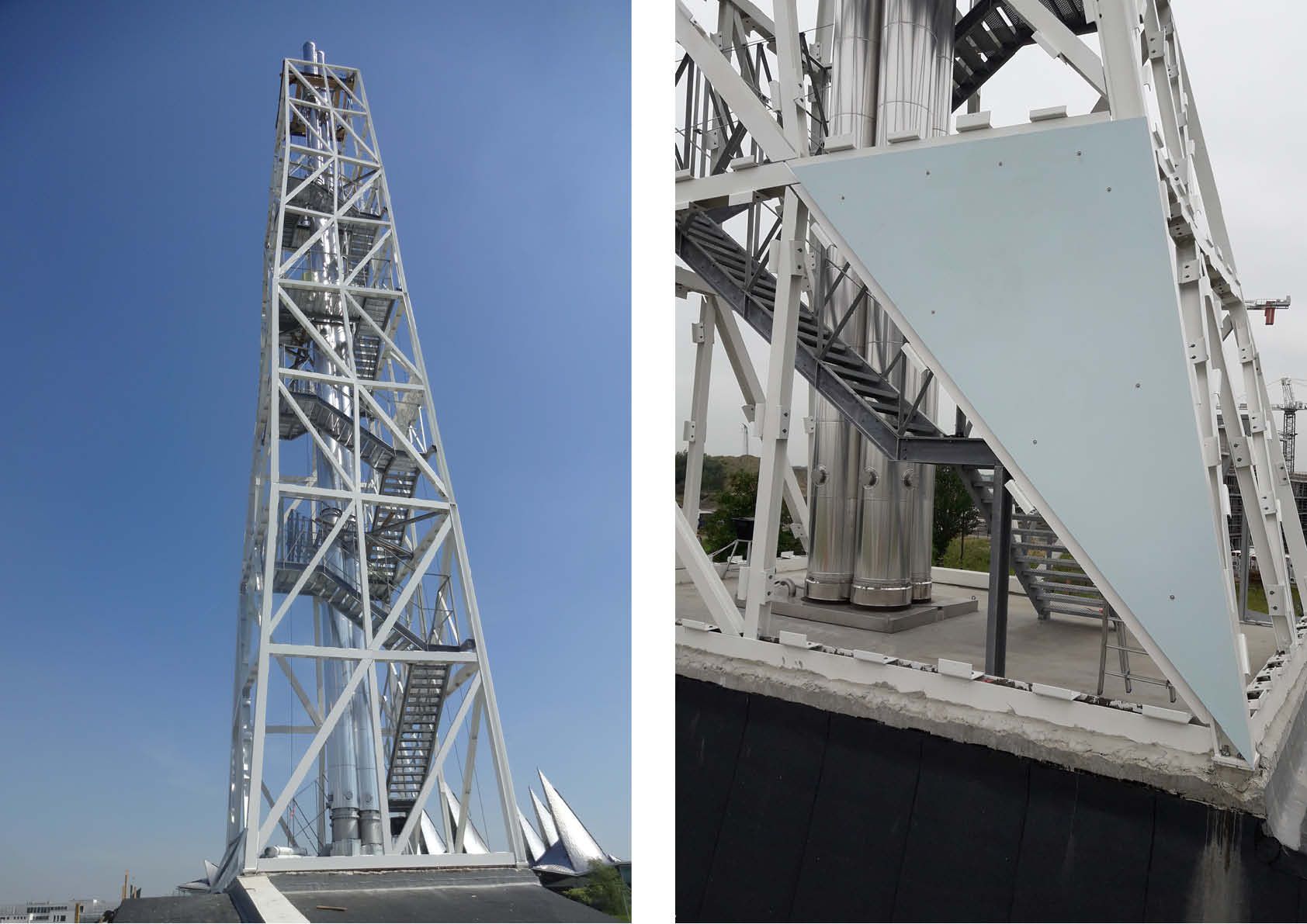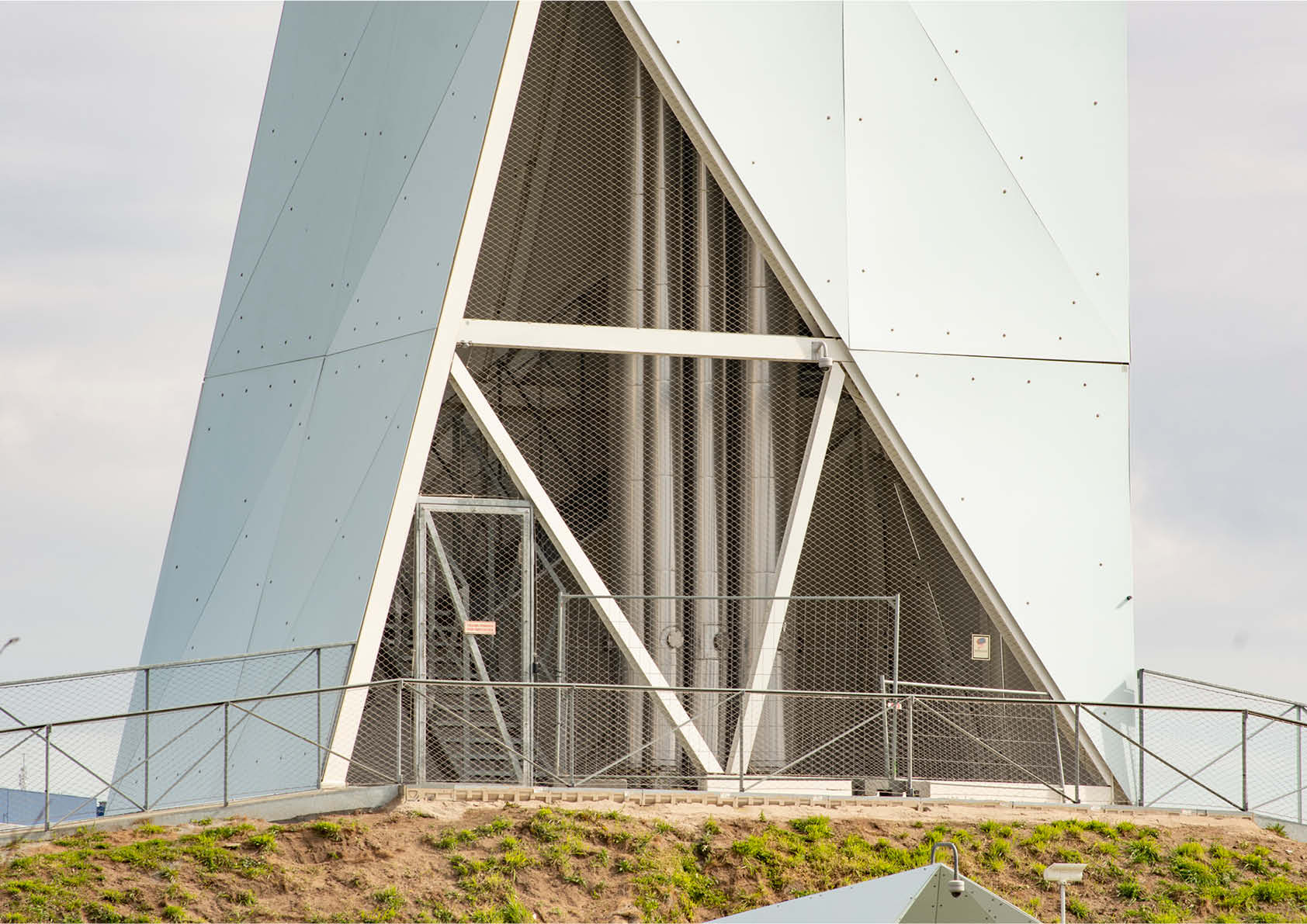 La tour est judicieusement structurée. Chacune des quatre faces est une structure triangulée composée de profils HE A/B/M avec les diagonales principales et les colonnes d’angle formant les plis caractéristiques. La structure en acier a été réalisée en S355-J2. Pour certaines tôles de tête, du Z15 était nécessaire. La protection contre la corrosion a été obtenue par le biais de la galvanisation et d’un système de revêtement par laquage liquide C4, garantissant une longue durée de vie.