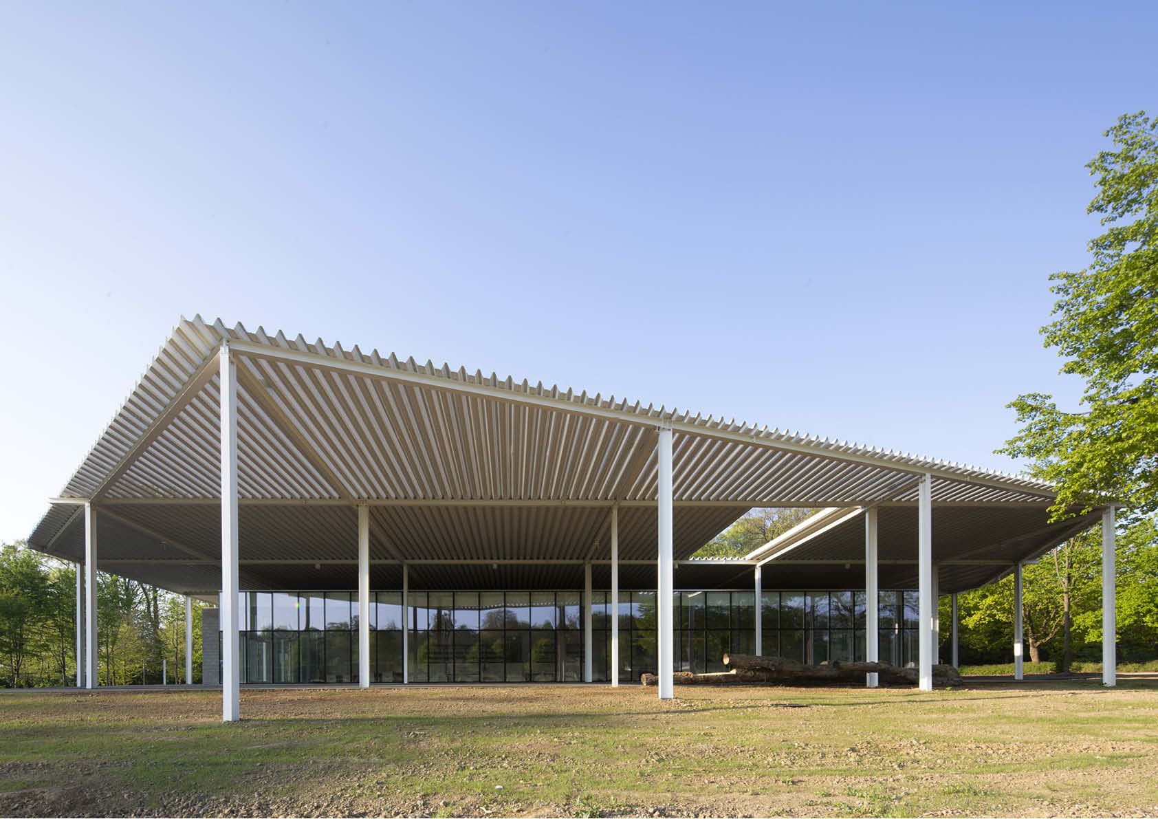 Le bâtiment lui-même est constitué d’un volume en verre abritant la réception proprement dite et une boîte fermée avec les fonctions administratives, le stockage, les archives, la bibliothèque, la salle de réunion et les installations sanitaires. Ce volume est composé d’un mur-rideau porteur de 37 tubes d’acier sur trois côtés avec une hauteur de 4,45 m.