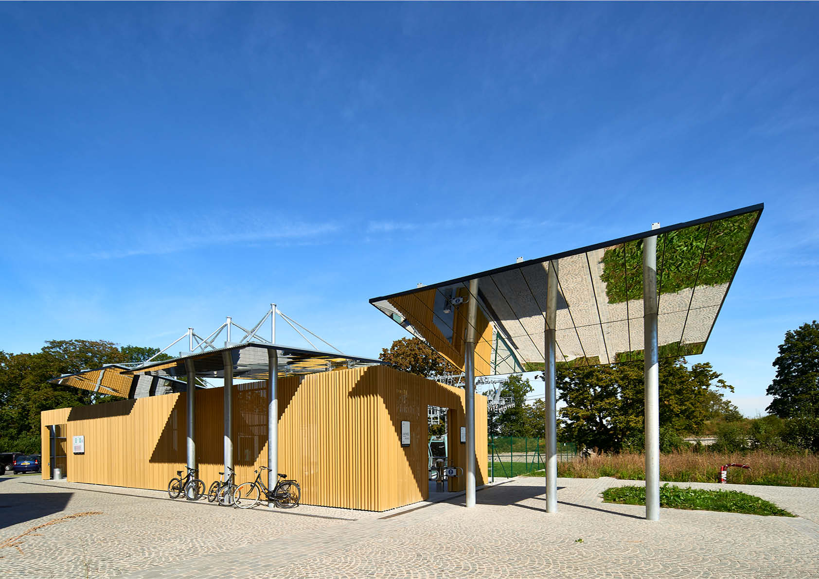 Concevoir des stations de téléphérique n’est pas un type de projet courant pour les architectes. Il faut également tenir compte du fait que les stations doivent à la fois s’intégrer dans le bâti construit existant et attirer l’attention, signifier leur présence aux passants et aux utilisateurs. C’est pourquoi les concepteurs ont opté pour un bardage de façade métallique microperforés et aux ondes particulières qui offriront aux stations amont et aval une transparence évolutive, dynamique et esthétique.