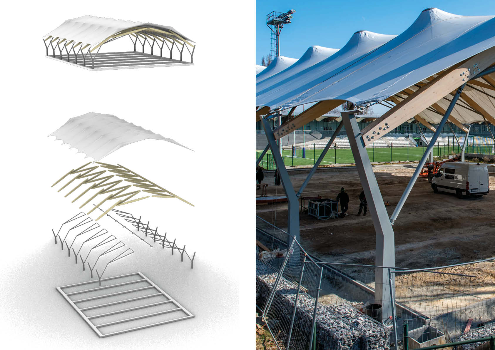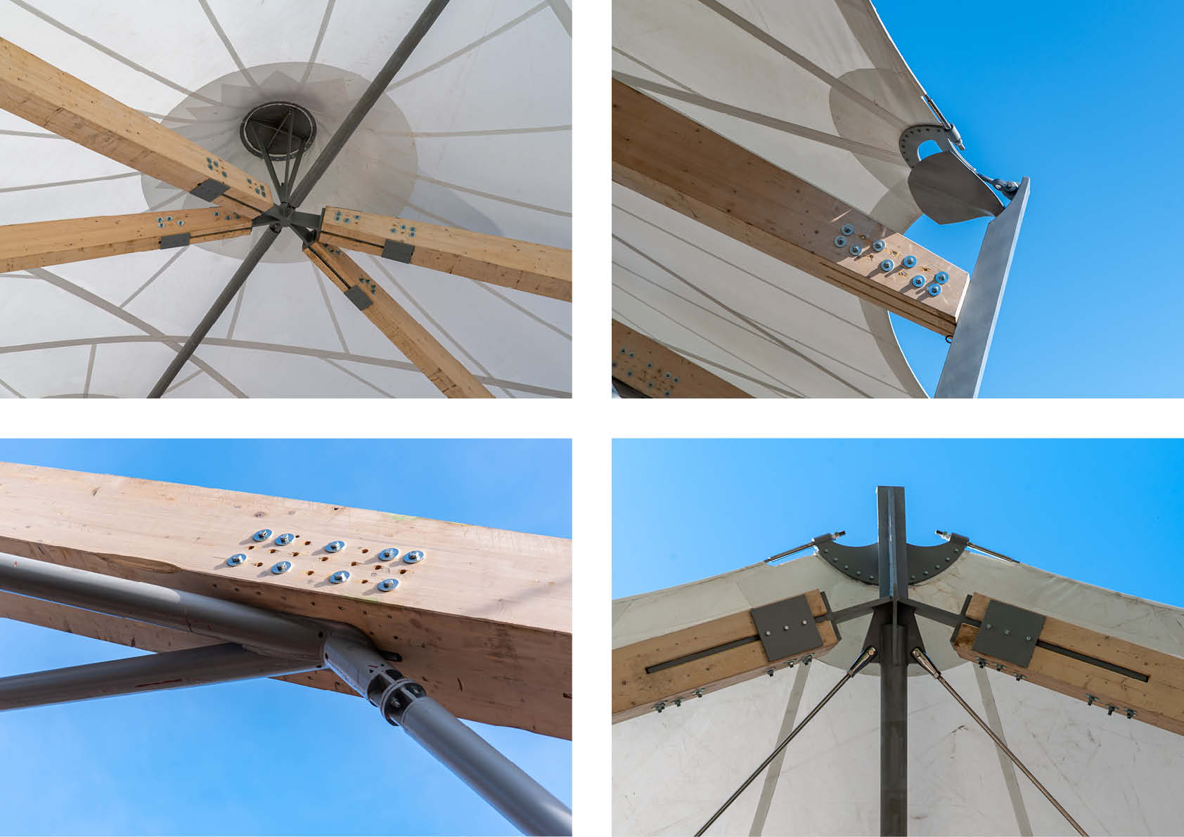 La partie supérieure de ces portiques sur laquelle « s’appuie » les pièces de support de la toile sont des poutres en bois lamellé-collé en forme de Y. Tous les autres éléments des portiques, comme les colonnes (caissons PRS à géométrie variable), les bracons ainsi que les assemblages de géométries complexes entre poutres ont été réalisés en acier S355. Au total, ils mesurent chacun plus de 10 mètres. Dans un souci d’esthétique, les assemblages entre les poutres bois elles-mêmes et ceux de ces poutres en bois avec la structure acier sont pratiquement invisibles.
