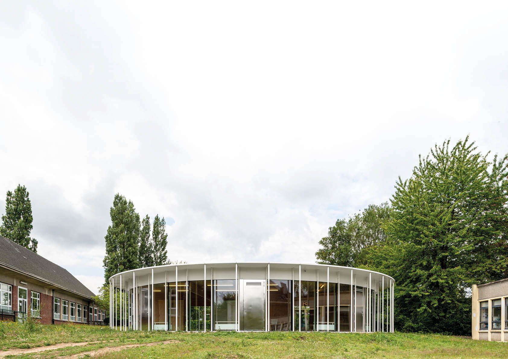 L’école primaire de Denderleeuw avait besoin de classes polyvalentes supplémentaires. Un bâtiment circulaire prévu pour le site est présenté conjointement avec GO! au campus de l’école. Une légère structure en acier est placée autour des murs du pavillon pour constituer la base de la circulation couverte contournant le bâtiment et permettant d’accéder aux locaux de classe.
