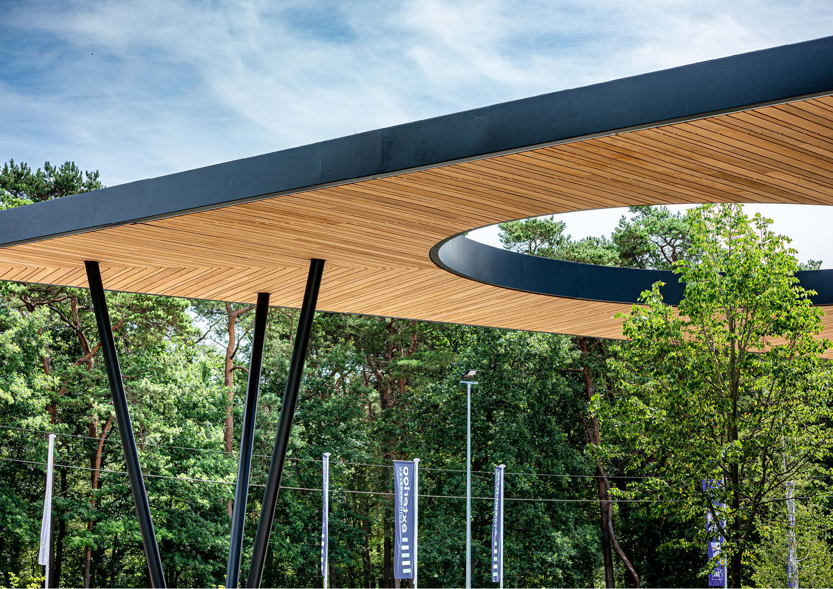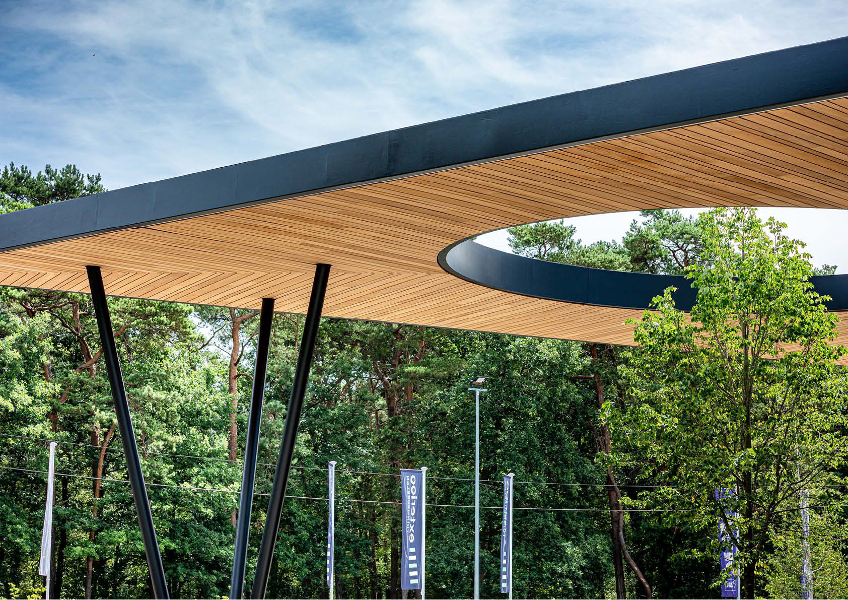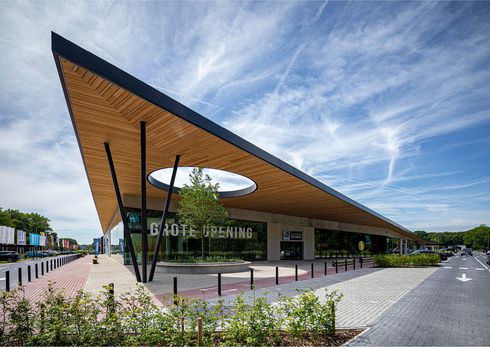 L’ancien site d’une entreprise de meubles à Zoersel a été transformé en un centre de shopping comprenant huit magasins. Afin de maintenir l’équilibre entre l’environnement naturel et les bâtiments, un auvent en acier remarquable et impressionnant de 17 mètres a été choisi. Une ouverture circulaire est prévue dans l’auvent dans lequel pousse un arbre de huit mètres de haut.
