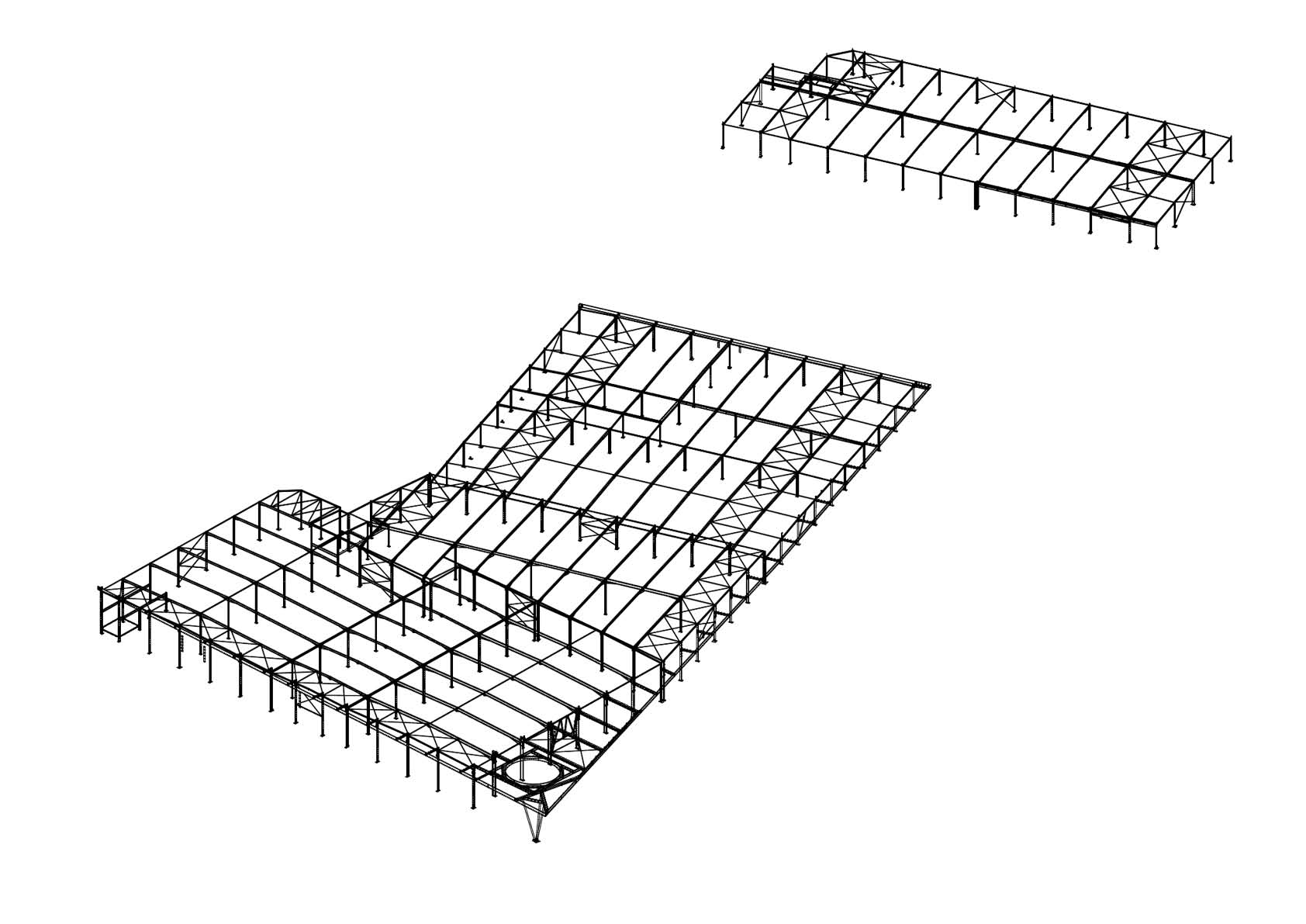 La structure en acier se compose de profilés d’acier, de qualité 235 et 355. Les composants sont sablés, apprêtés et peints d’une couche de phosphate de zinc. Les composants sur l’extérieur sont galvanisés et laqués à l’aide d’un système à deux composants à base de PU. De l’acier plat a été utilisé pour la fabrication de toutes les pièces de connexion et les plaques au sommet et à la base de la structure.