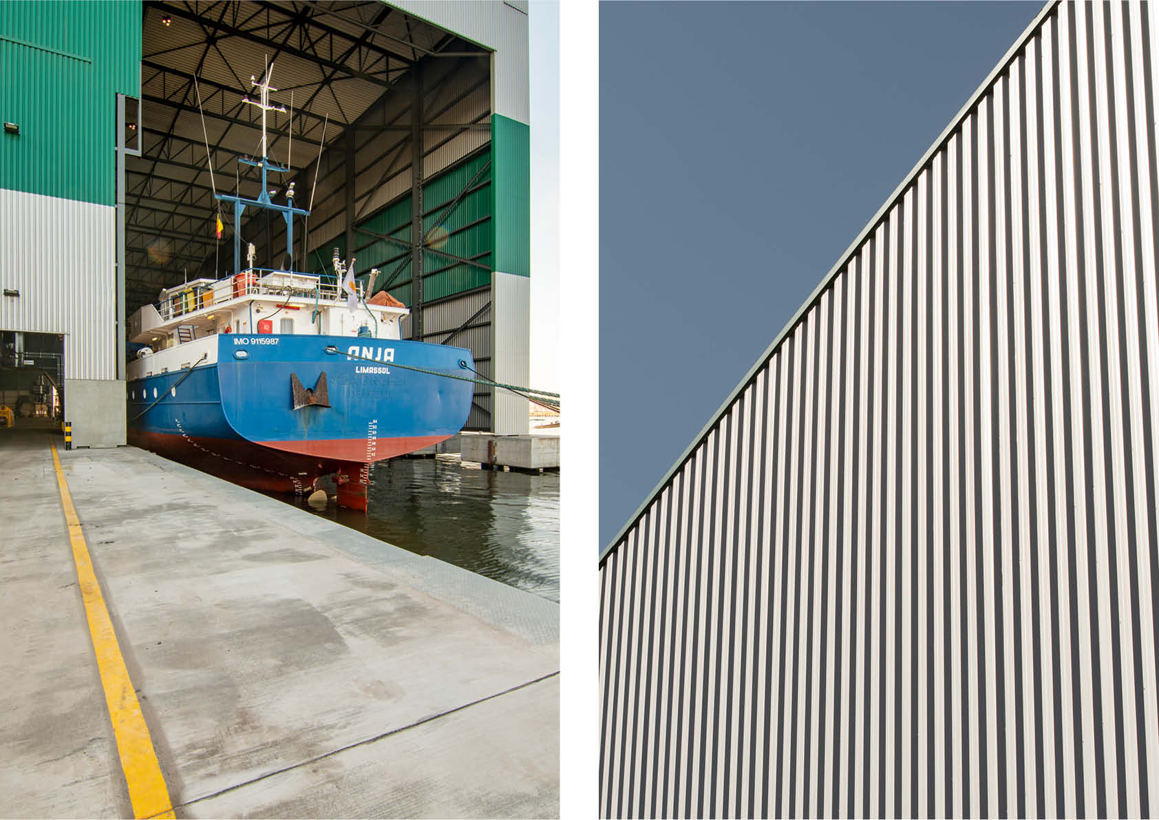 Le quai couvert de 200 mètres de long, avec son dock d’une largeur de 25 mètres et un volume de 30 mètres au-dessus de l’eau, est une caractéristique unique de l’All Weather Terminal. Il permettra aux péniches et aux bateaux de mer d’une capacité de charge maximale de 10 000 tonnes et d’un tirant d’eau maximal de 8,20 m de s’amarrer au nouveau quai, bien à l’abri des intempéries.