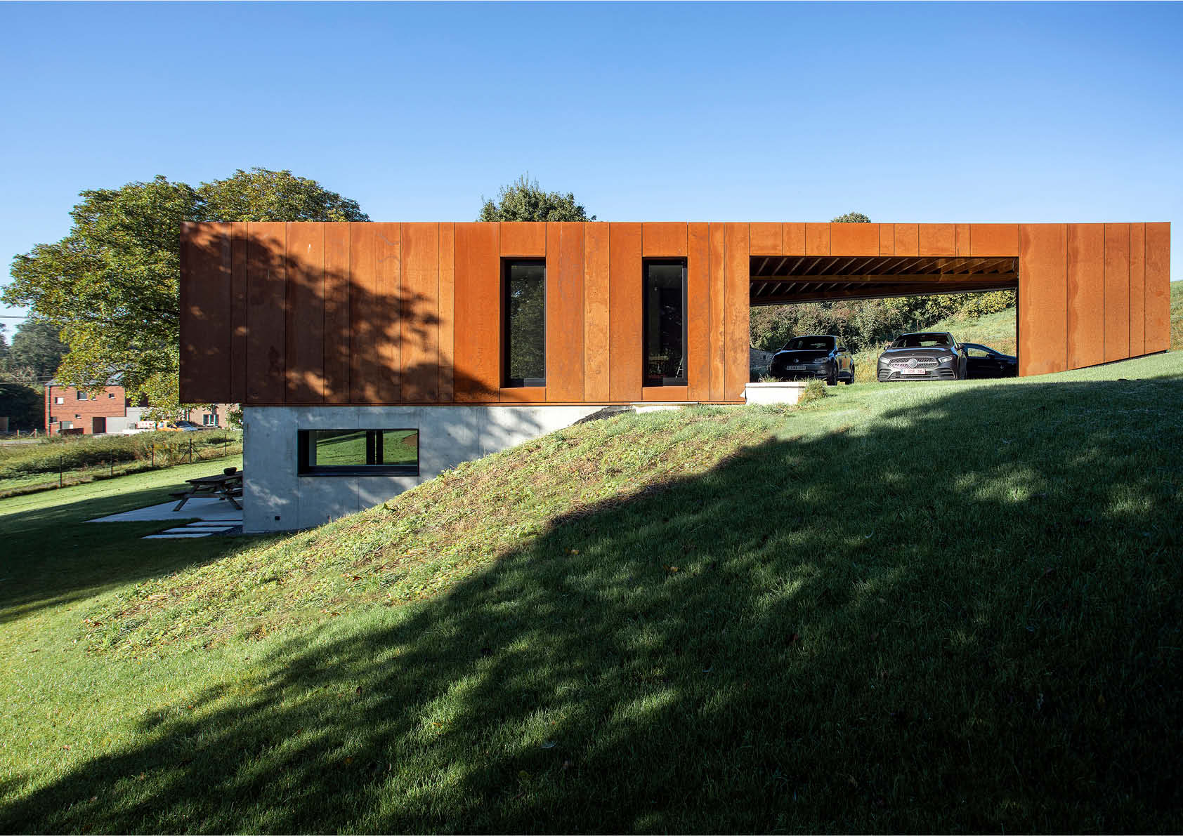 Pour éviter une ambiance trop froide, les maîtres d’ouvrage ont fait installer un bardage en acier Corten sur l’ensemble des façades du niveau 0, pour un total de plus de 138 m². De largeurs différentes, les panneaux apportent également rythme et relief à l’intérieur. Au-delà de son aspect esthétique de la rouille et la patine caractéristiques de l’acier Corten, celui-ci s’avère également être un choix pratique : grâce à ses qualités auto-protectrices, il ne requiert aucun entretien.