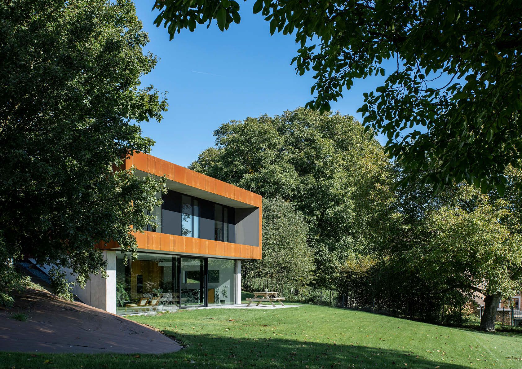 Les maîtres d’ouvrage de cette maison, passionnés d’architecture, ont décidé d’allier béton et acier corten, pour des raisons pratiques comme esthétiques. L’élément porteur de la structure est un voile de béton de 6 mètres de haut, coulé sur place et laissé apparent pour un style délibérément brut. Les murs et les plafonds sont conçus en dalles de béton coffrées et la dalle de sol est en béton lissé à l’hélicoptère.