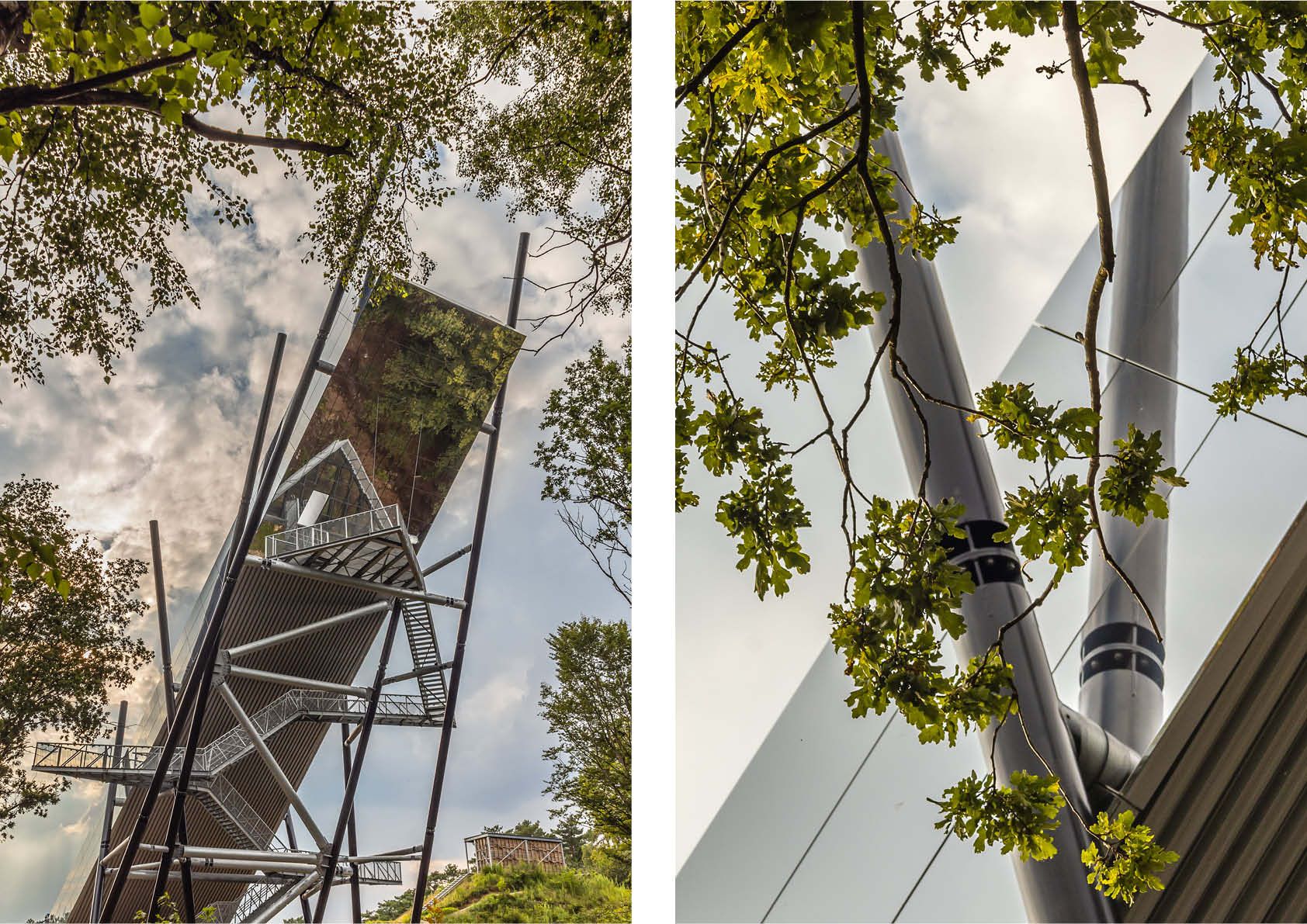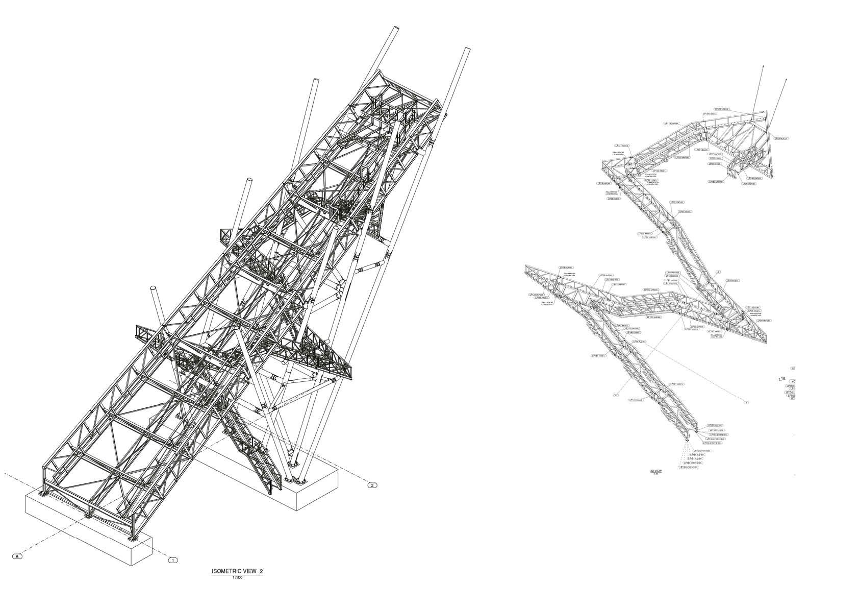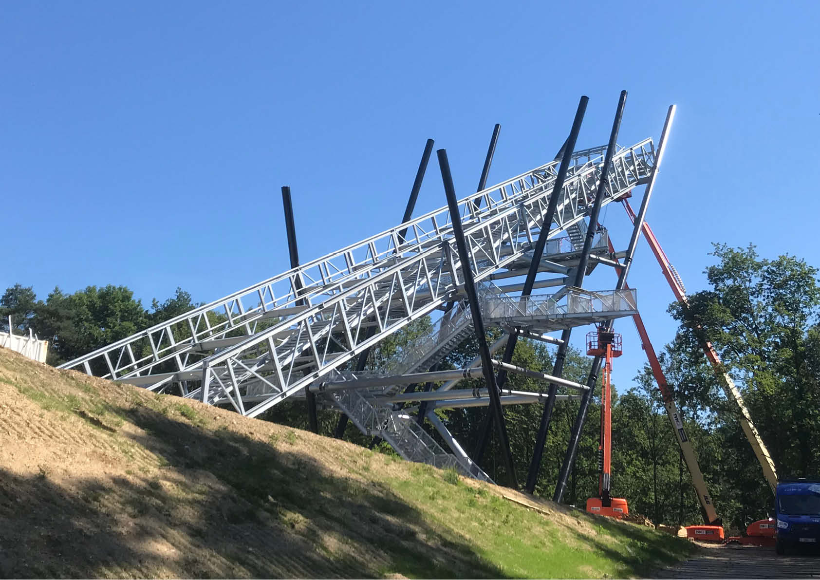 Outre sa conception inhabituelle, avec des colonnes tubulaires noires Ø508x16 qui semblent avoir été insérées dans le sol de manière aléatoire, la dry slope est également remarquable pour le tracé sinueux en forme d'éclair sous la rampe, qui donne accès à deux plates-formes d'observation, nichées respectivement à 25 mètres et 35 mètres.