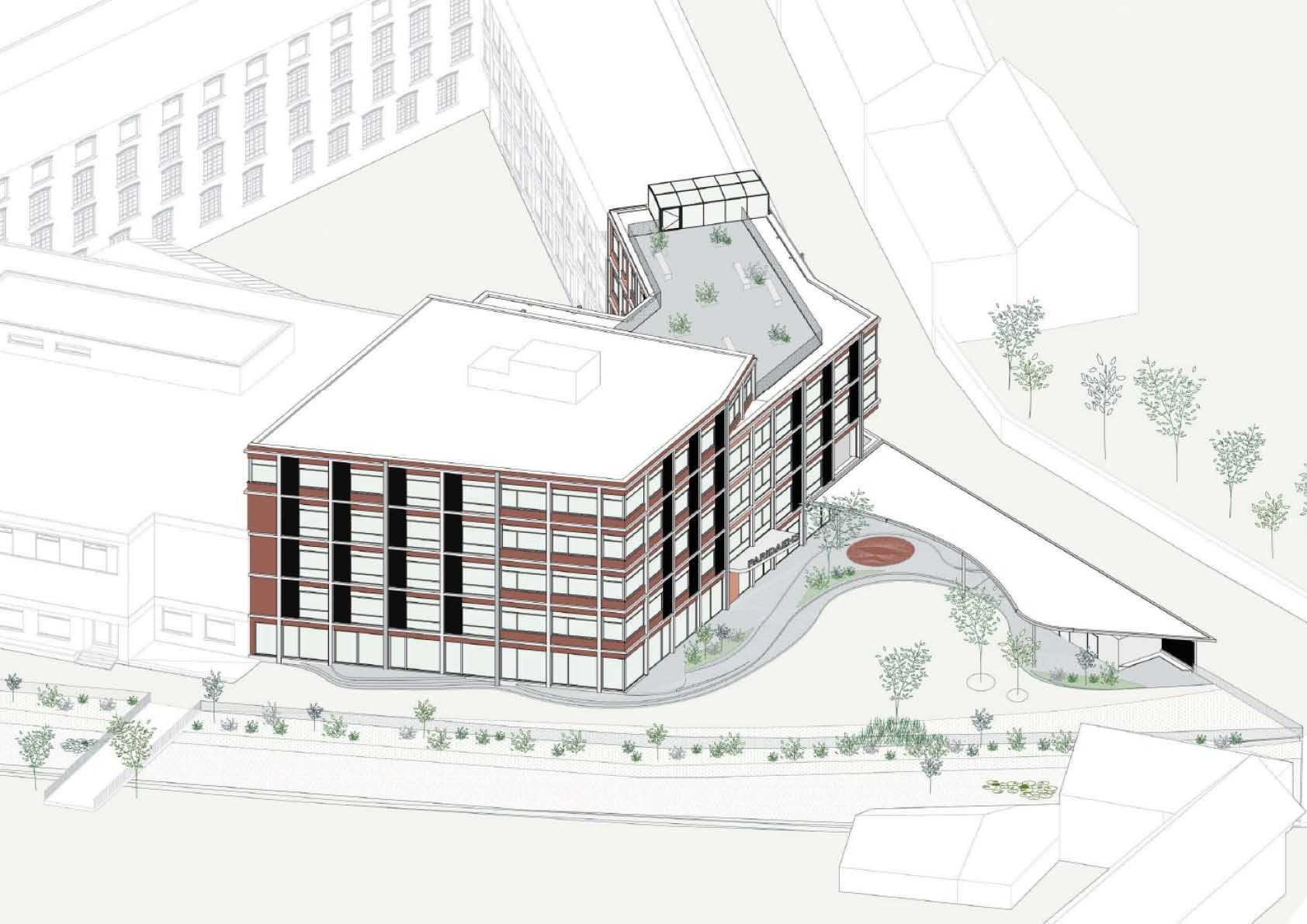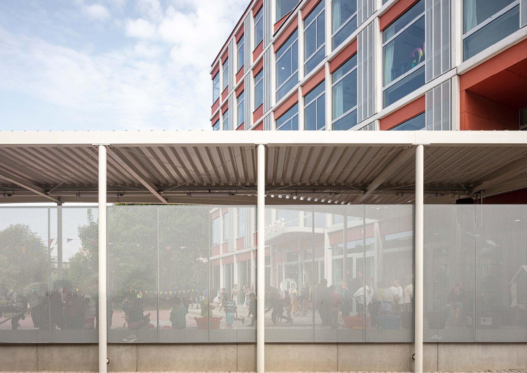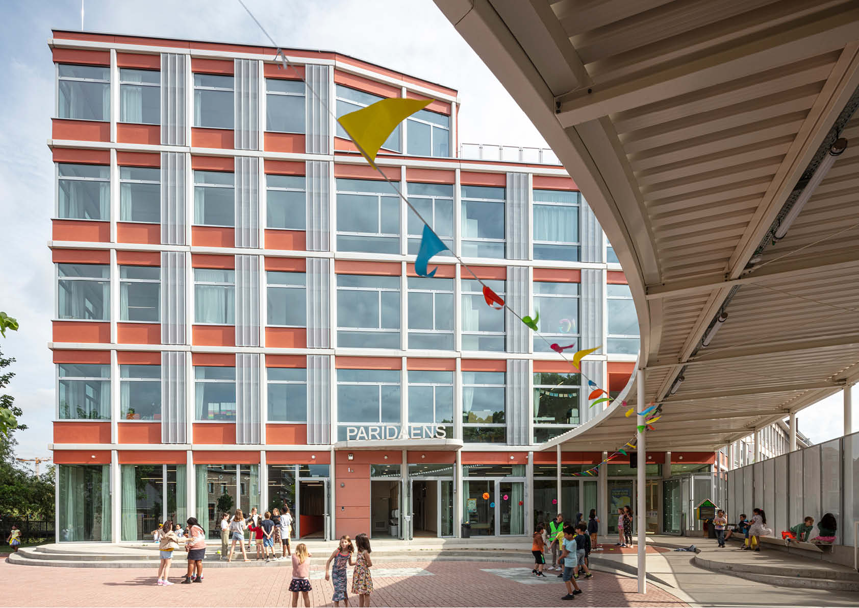 La réalisation de la nouvelle aile de l'Institut Paridaens constituait la dernière phase d’un masterplan global. Cela a donné au campus un aspect proéminent dans la ville, en tant que repère visuel et orientationnel. Un grand auvent aux formes fluides a été fixé aux structures existantes et complète le tableau.