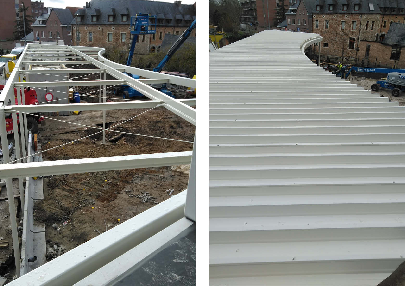 La structure (6,7 tonnes), constituée de profilés, de tubes et de tuyaux ronds en acier (S235), a été galvanisée à chaud et recouverte par pulvérisation avec un coating RAL 9001. Le bord de l’auvent a été réalisé à partir de caissons, qui ont été laminés avec différentes courbures pour obtenir une ligne ondulée. La toiture (150 m2) est constituée de tôles d'acier profilées autoportantes, revêtues sur les deux faces d’une couche de RAL 9001. La gouttière est constituée d'une tôle d'acier plissée fixée contre le caisson latéral porteur et a également été galvanisée et pulvérisée. Des évidements ont été prévus dans ce caisson, au niveau des colonnes d'acier (tuyaux ronds), pour évacuer les eaux de pluie.