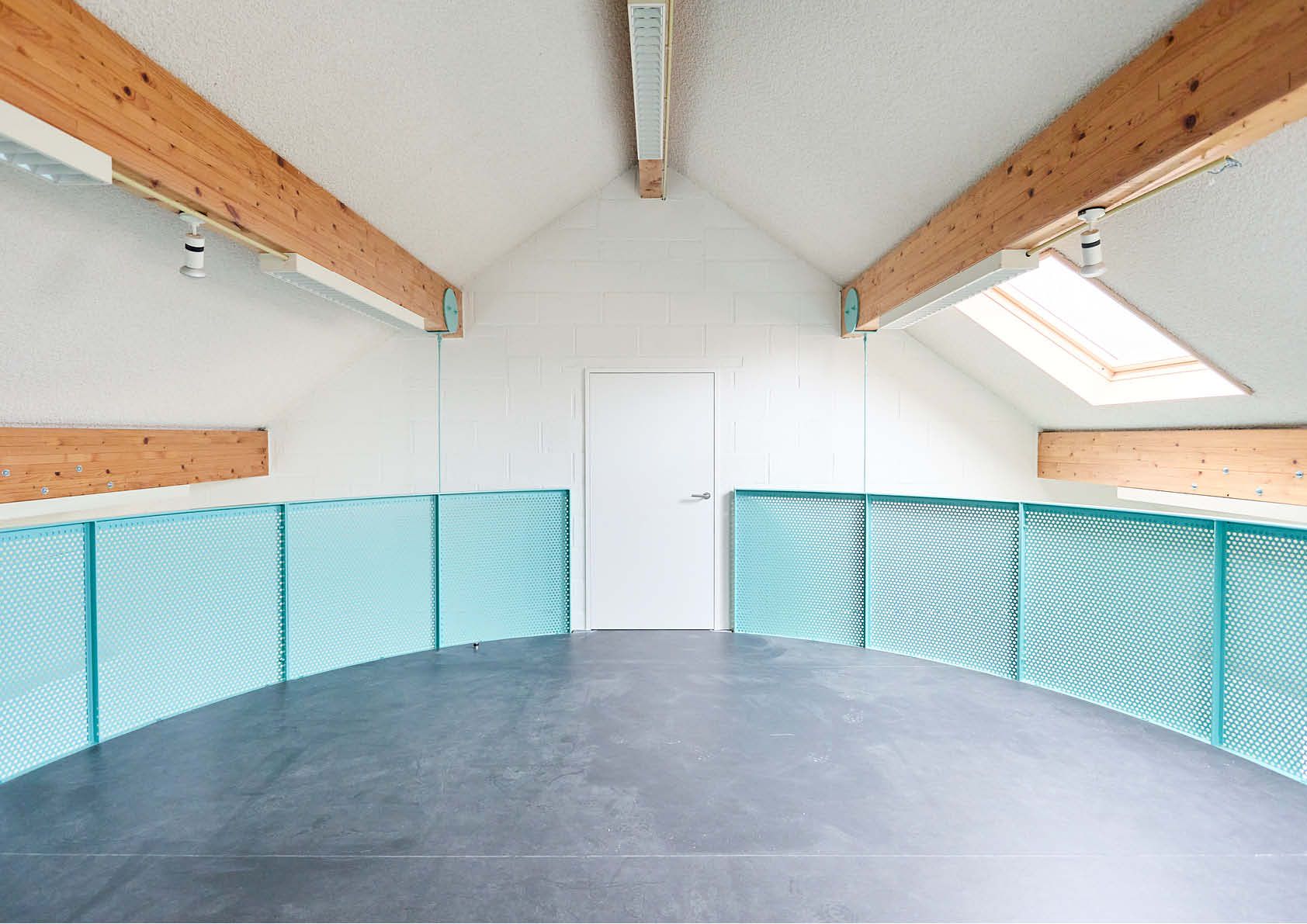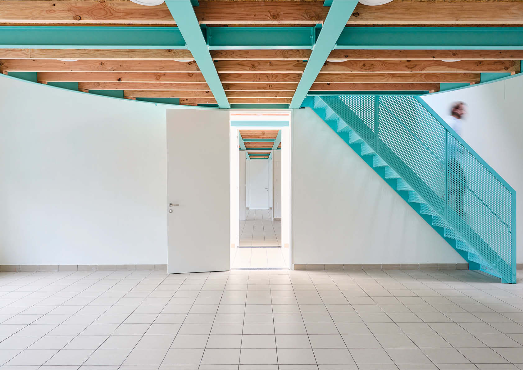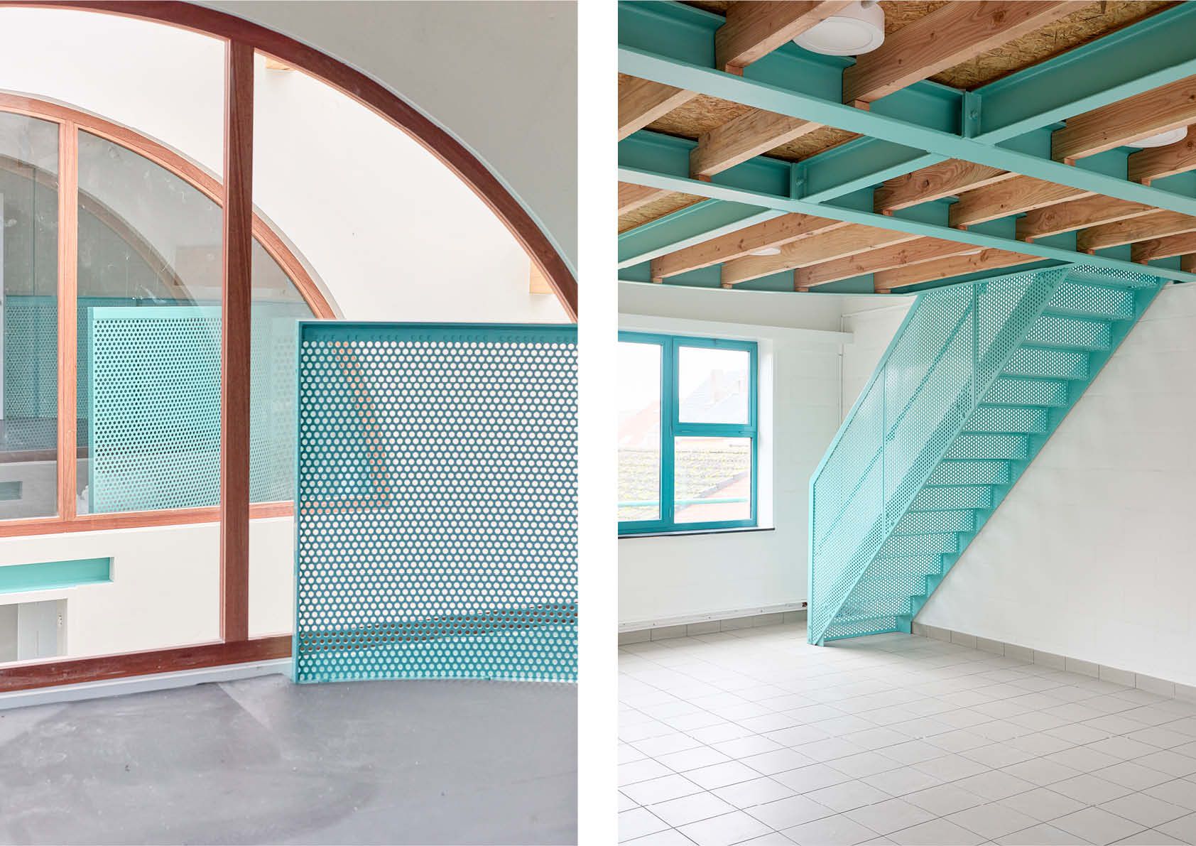 Les escaliers assortis et les balustrades adaptées aux enfants ont été construits en tôles d'acier perforées. Cela a permis de créer des cocons silencieux et fermés, mais qui laissent tout de même passer suffisamment de lumière et offrent des vues sur les salles de classe situées en dessous. Les mezzanines sont peintes dans une couleur bleu-vert déjà présente dans le bâtiment. Petit avantage supplémentaire, les structures en acier boulonné sont magnétiques et peuvent donc également servir de tableaux magnétiques éducatifs.