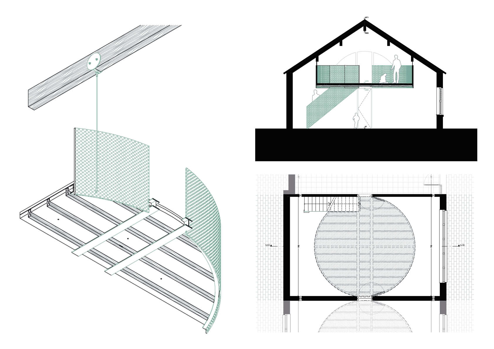 Les disques circulaires, qui semblent flotter dans l'air comme des nuages, sont composés de profilés en acier S235JR - quatre segments de profilés UPN laminés, deux grands profilés HEB et un profilé IPE - qui sont suspendus à la structure stratifiée de la toiture au moyen de tirants en acier et connecteurs spécifiques.