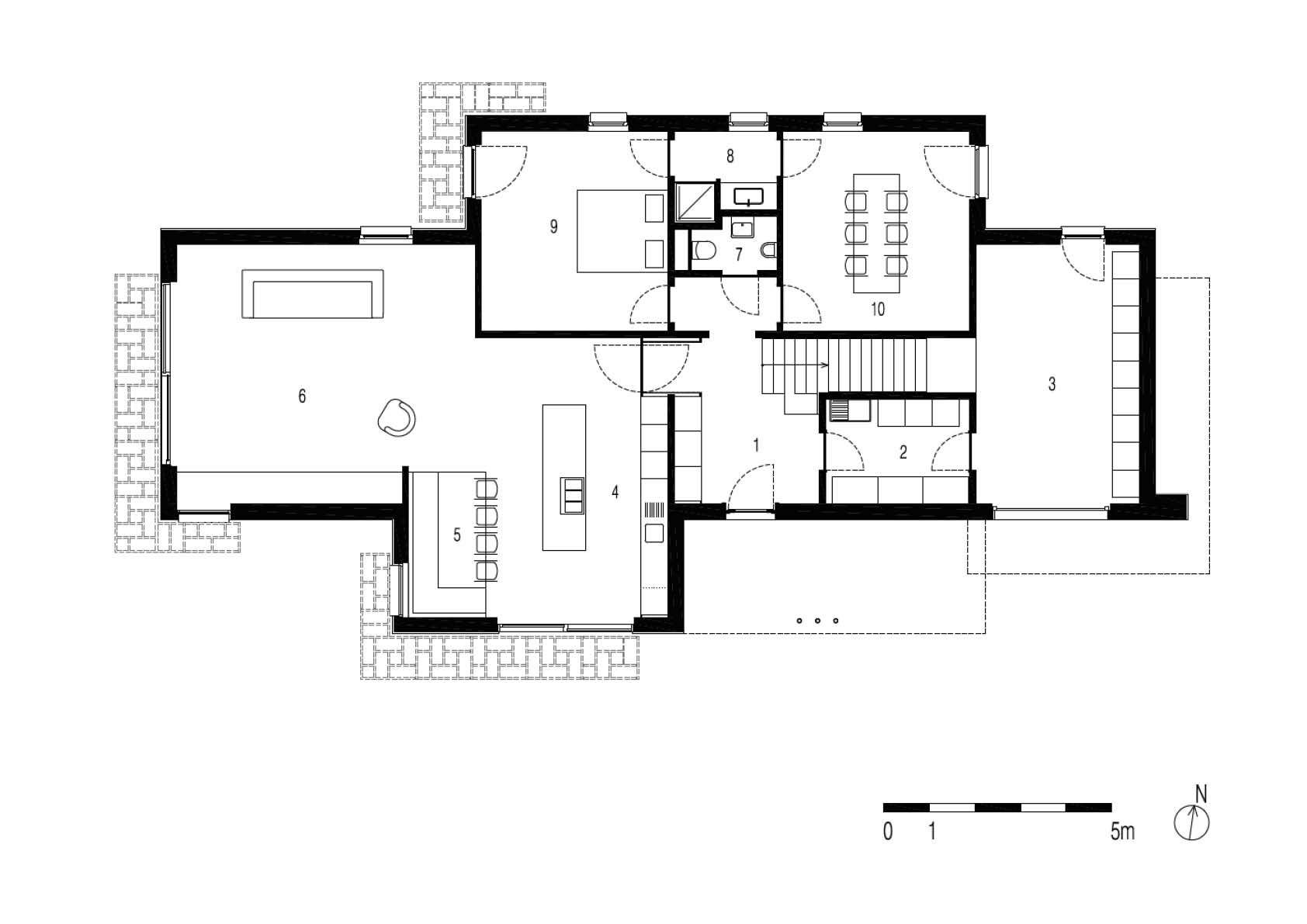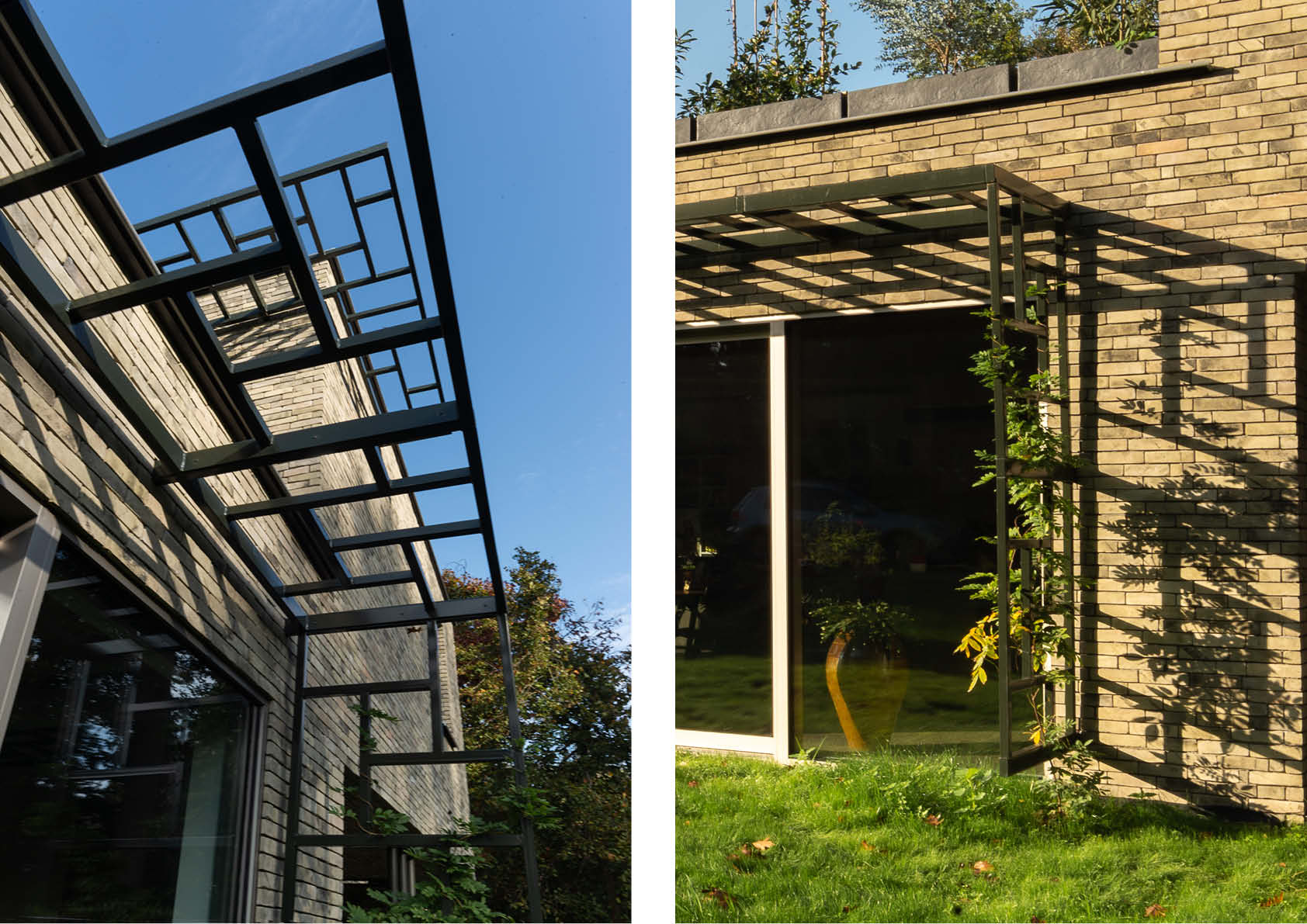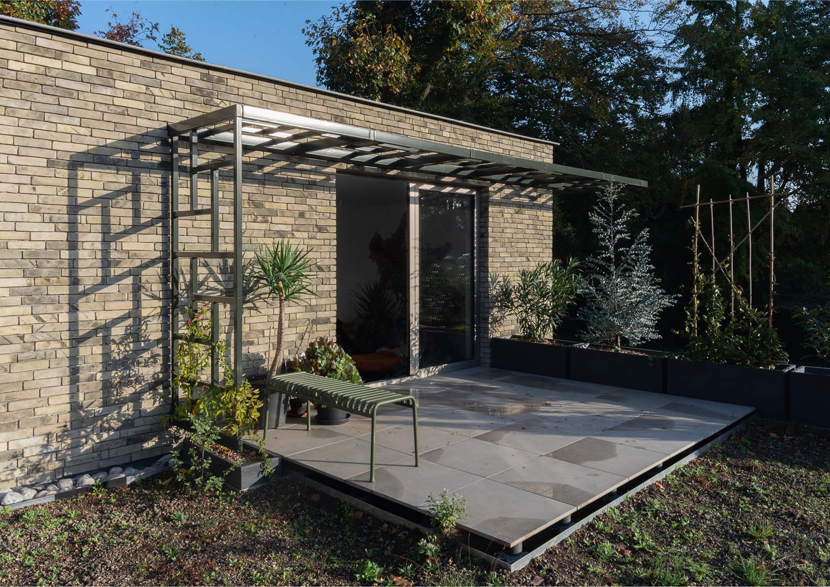 Grâce à sa forme, à l'utilisation judicieuse des matériaux et au choix spécifique des couleurs, cette maison unifamiliale, qui abrite également un bureau d’architecture, s'intègre parfaitement dans son environnement verdoyant. L'idée était d'éviter la surchauffe par les fenêtres vitrées orientées au sud et à l'ouest grâce à des plantes grimpantes, offrant ombre et fraicheur, sur trois auvents en acier. Ils se composent chacun de trois plans, divisés en segments avec un motif récurrent et suspendus entre des ailettes en acier fixées au gros oeuvre.