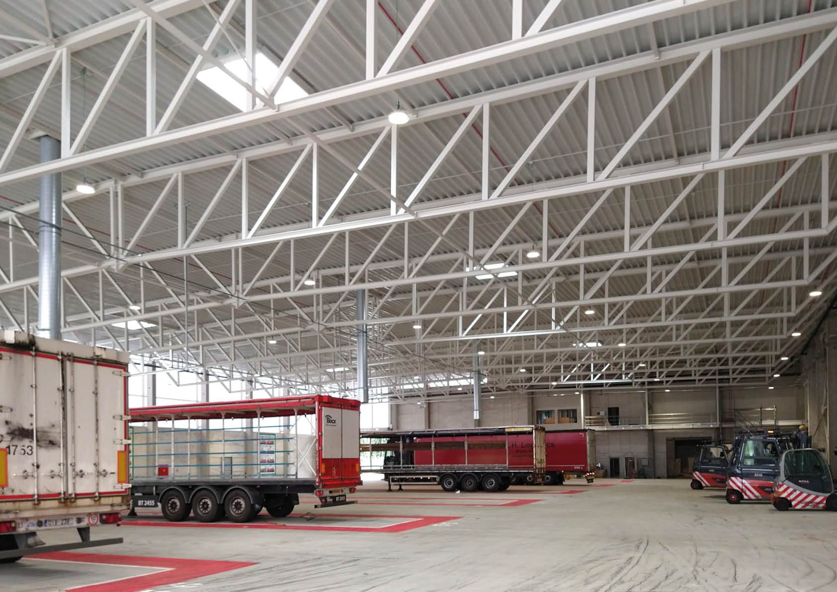 Au total, le projet représente quelque 17 500 m² d’entrepôts et de structures en auvent. Les applications de l’acier dans le cadre de ce projet sont légion : des charpentes en acier d’une portée allant jusqu’à 54 mètres et d’un poids maximal d’environ 8,5 tonnes (soit 936 tonnes au total), des passerelles suspendues en acier (plus de 27 tonnes de tôles larmées), un bardage composé d’environ 8500 m² de panneaux sandwich en acier et d’environ 17 500 m² de panneaux de toiture profilés en acier. La production devant se poursuivre pendant toute la phase d’exécution, les différentes parties du bâtiment ont été phasées.