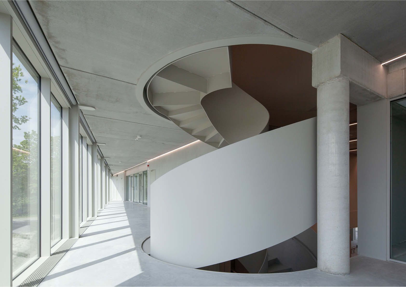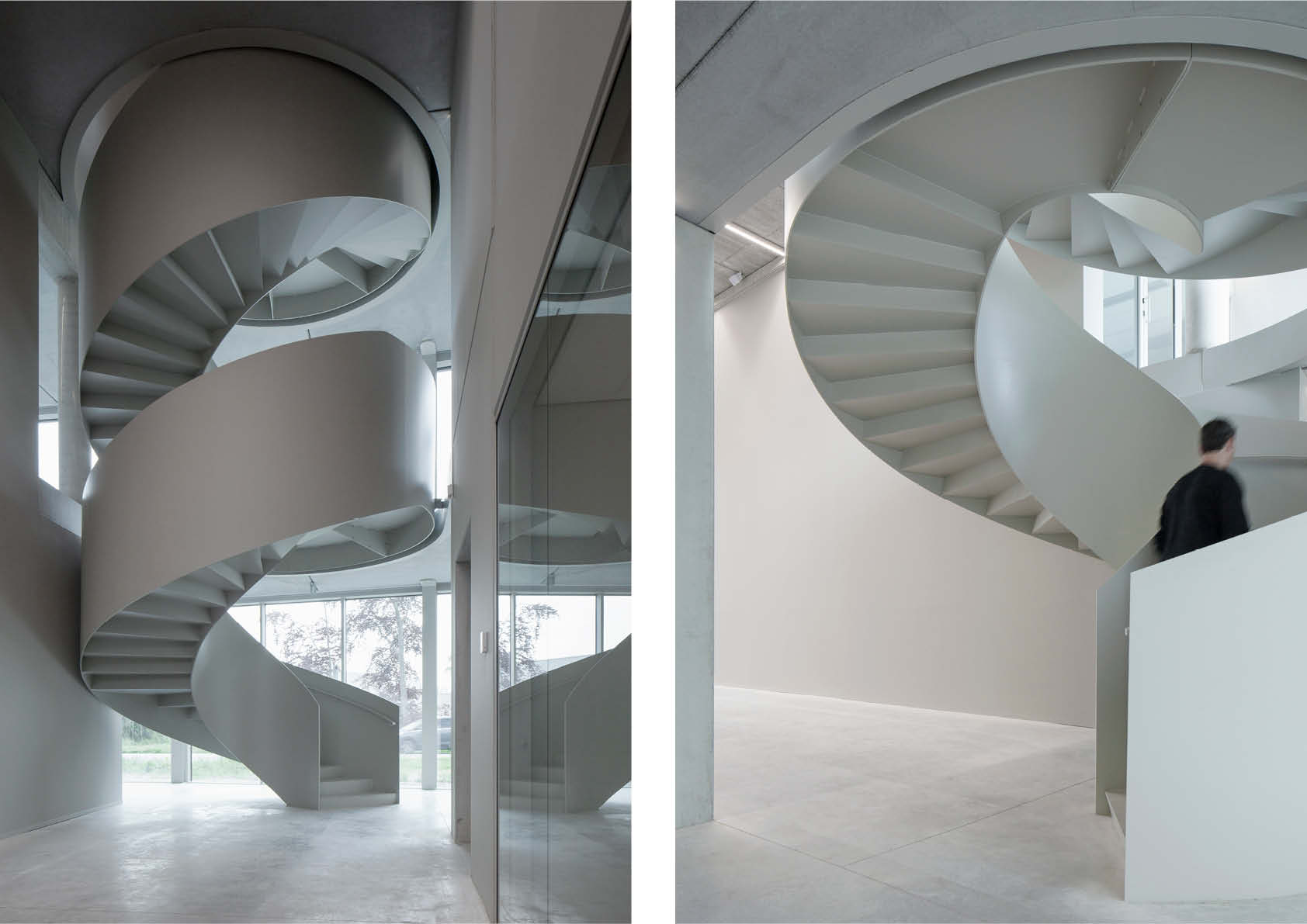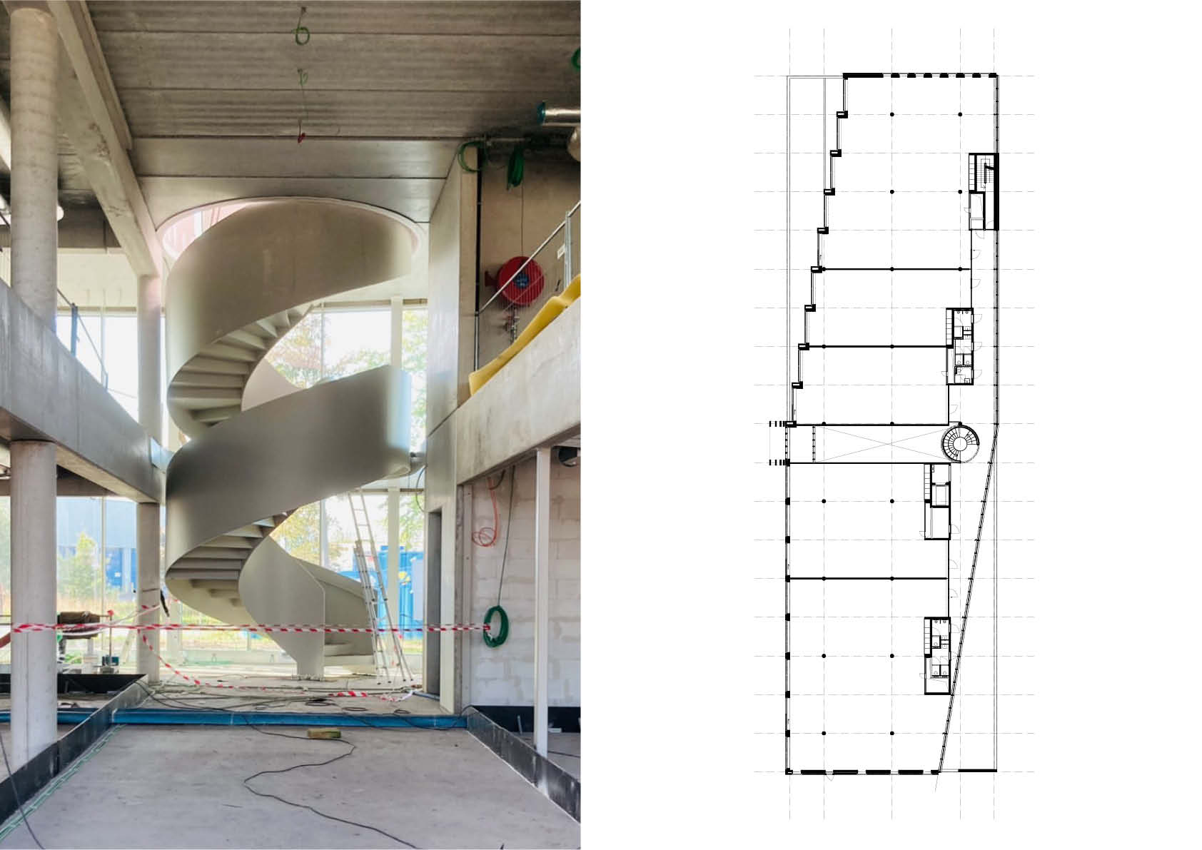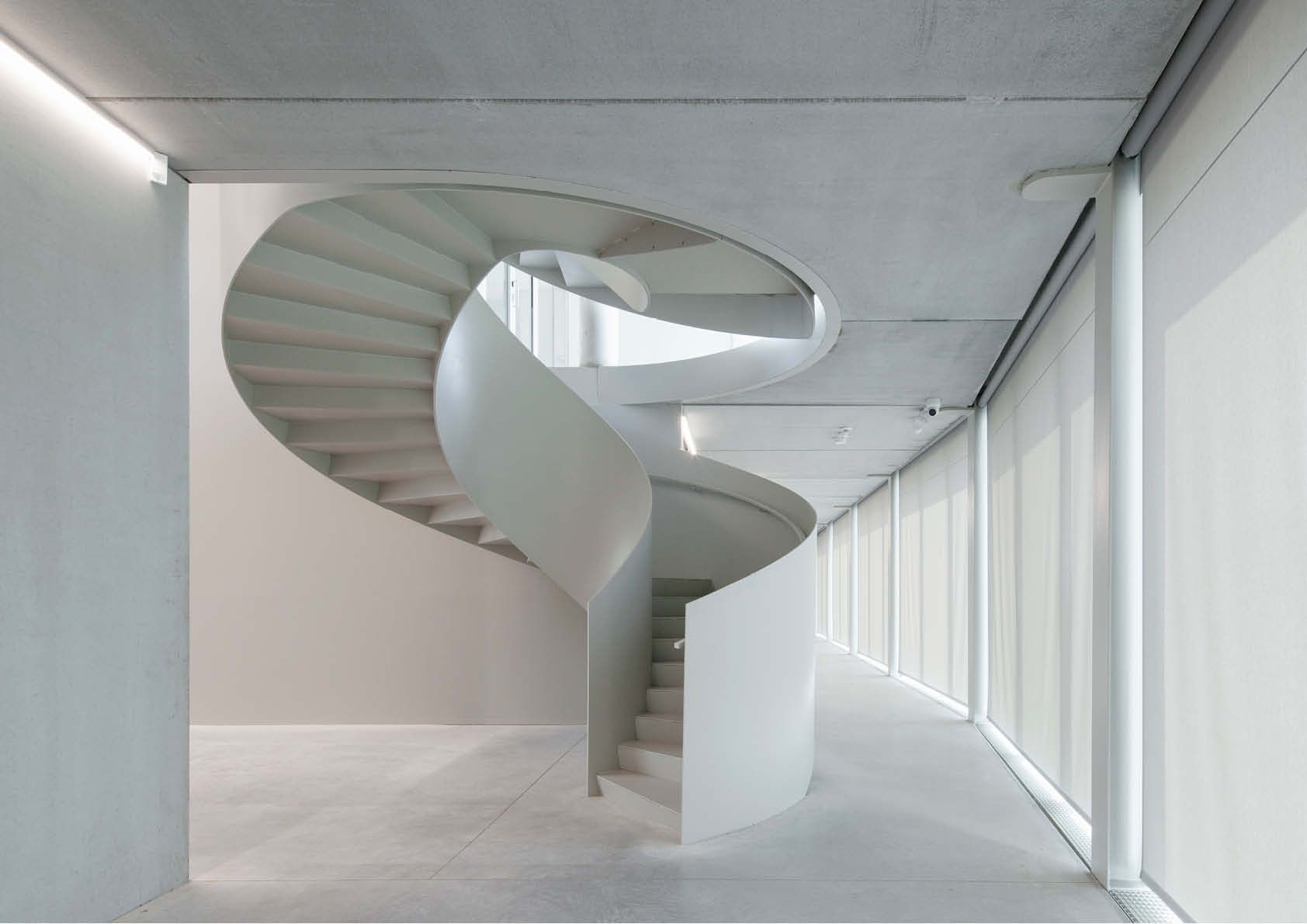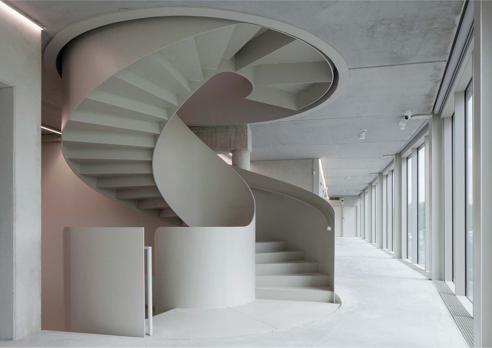 La recherche d'un design élégant a abouti à la réalisation d'une structure autoportante en acier de 7,8 tonnes. L'escalier a été préfabriqué en atelier, en sections de deux étages. Elles ont été placées via une ouverture dans le toit et fixées à des platines de raccord et des goujons, qui avaient déjà été prévus dans le gros œuvre. Les paliers ont été inclus à l'intérieur du volume de l'escalier. A ces endroits, les balustrades ont été prolongées, ce qui fait que l'interruption n'est pas visible dans le volume. Cela crée un escalier architectural imposant avec une forte présence.