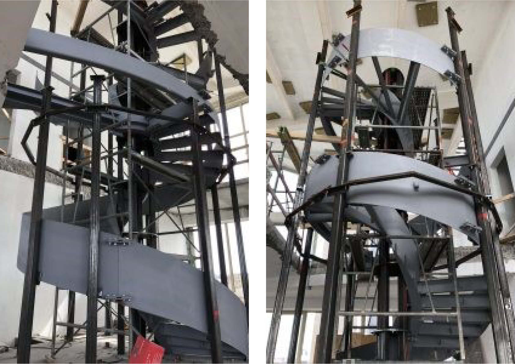 Bien que l'escalier en colimaçon ne pèse que 4,2 tonnes au total, il a été divisé en plusieurs parties de construction. Ces pièces ont en fait été hissées au sommet du penthouse et introduites par une étroite ouverture sur le toit du bâtiment. Les différentes parties de la construction ont ensuite été soudées ensemble sur place. Des accouplements d'assemblage ont été utilisés pour maintenir les relations entre les différentes parties de la construction.
