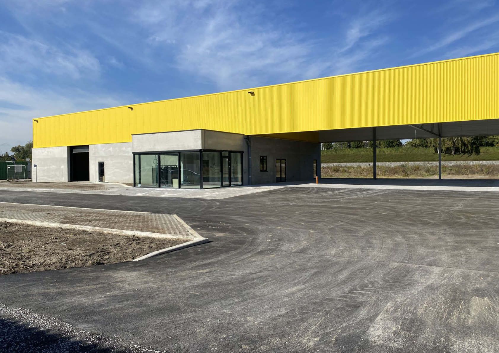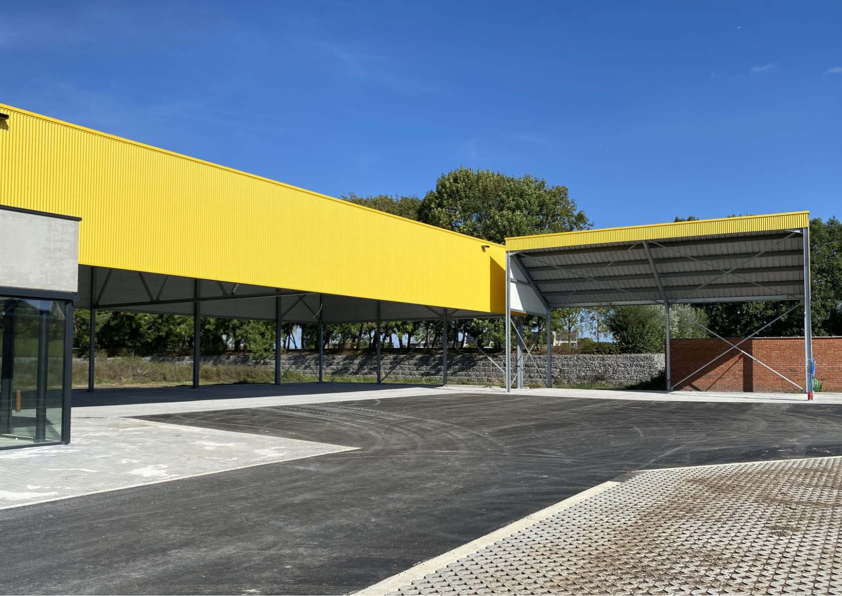 Le bâtiment se scinde en deux, avec le hangar d'un côté et l'auvent de l'autre. Au fond de l'abri, une "plinthe" en panneaux de béton forme un bel ensemble avec les blocs de béton pour le stockage du sel de voirie. Le volume supérieur du bâtiment s'étend comme un auvent au-dessus du parking où seront garées toutes les voitures de l'entreprise. Les tôles d'acier profilées procurent au bâtiment un aspect frais et contemporain. Les cadres de fenêtres et les portails en aluminium noir complètent le logo noir et jaune de Kapelle-op-den-Bos.