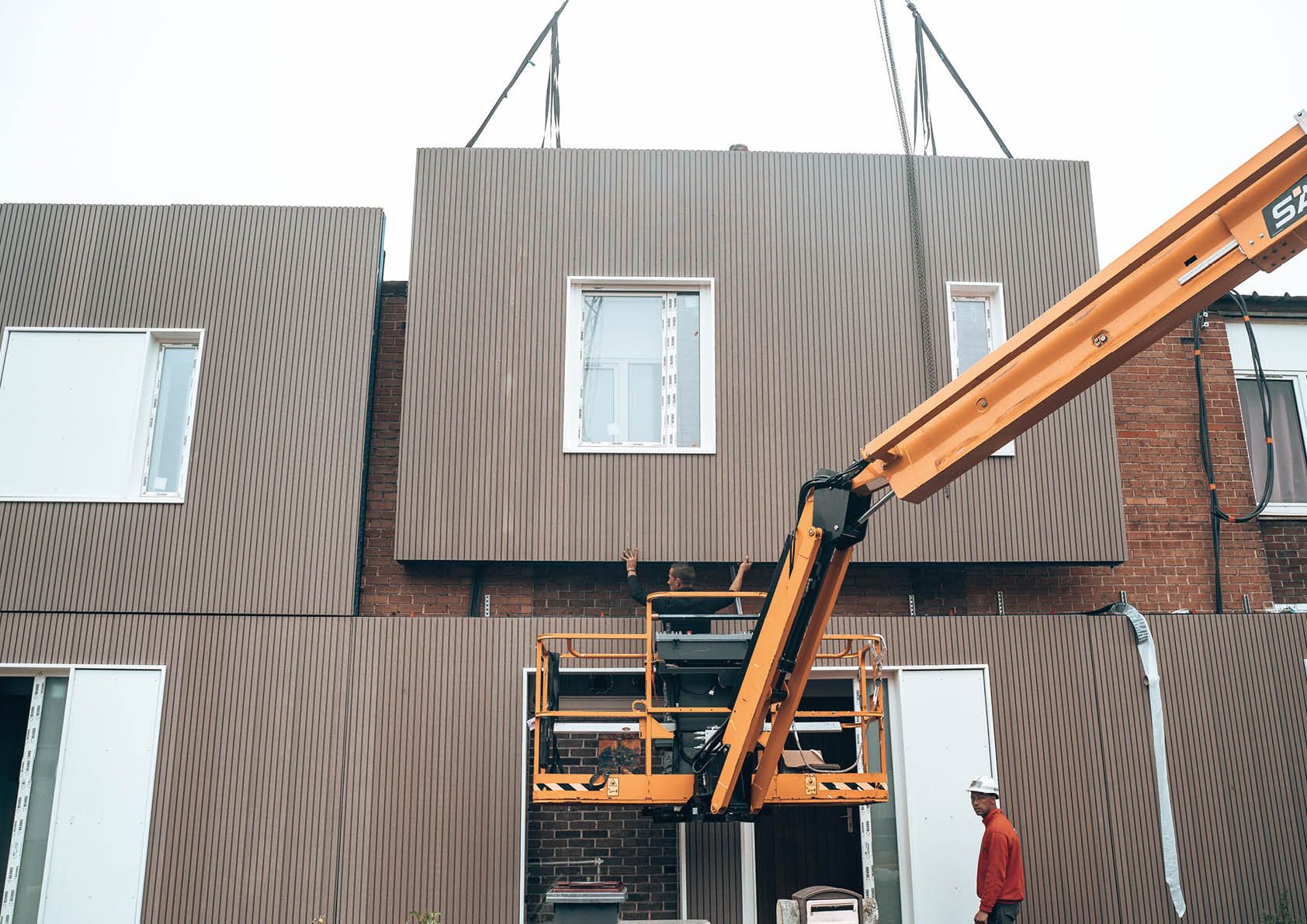 Ceci en plaçant une enveloppe de bâtiment isolante autour des maisons avec des façades et des toits complets assemblés dans un hall de production. Cela permet de réaliser en un temps record de grands projets tels que la rénovation énergétique d’un ensemble de logements sociaux. Les cadres en acier constituent la base de ce système. L’acier en tant que sous-structure n’optimise pas seulement l’utilisation des matériaux. Sa flexibilité et sa précision industrialisée en font un outil parfaitement adapté aux solutions préfabriquées.