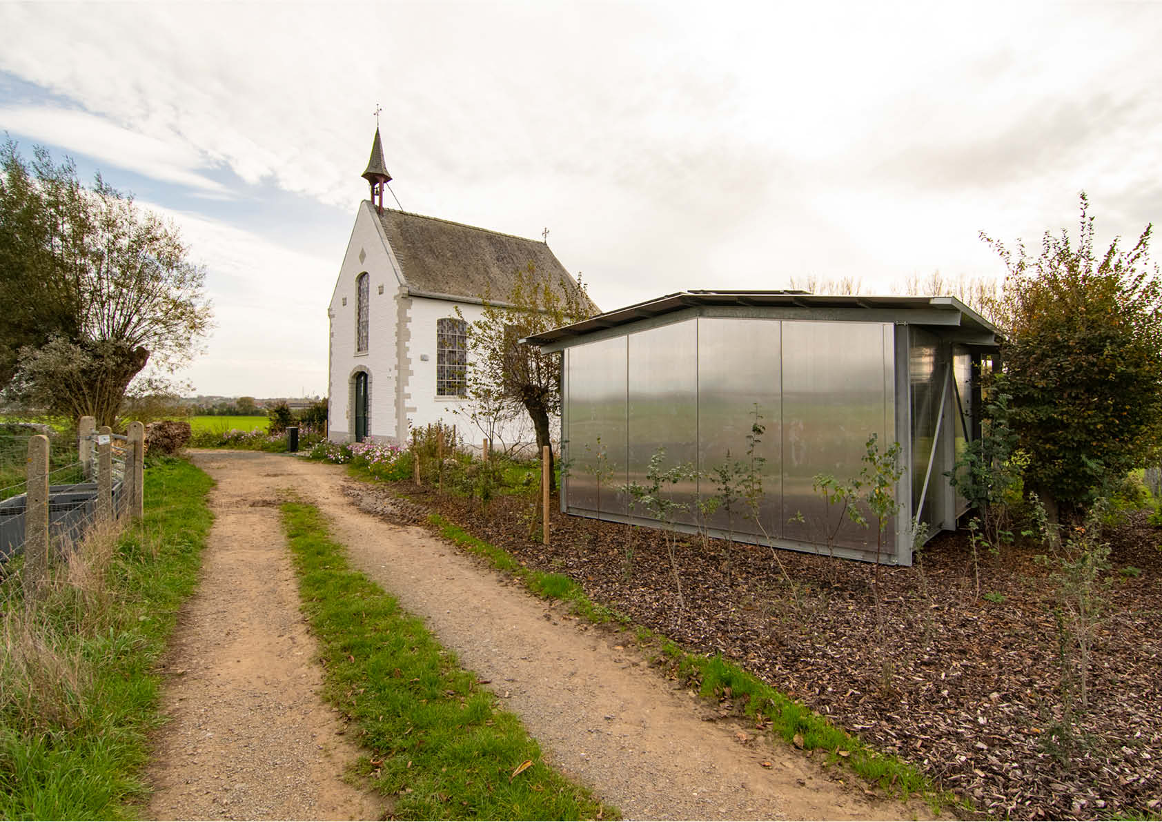 Une chapelle du XVIIe siècle située au milieu d'un champ dans la région de Dender est réaménagée en habitation. Une structure légère en acier est adossée contre le mur est et rend l'espace généreux habitable.