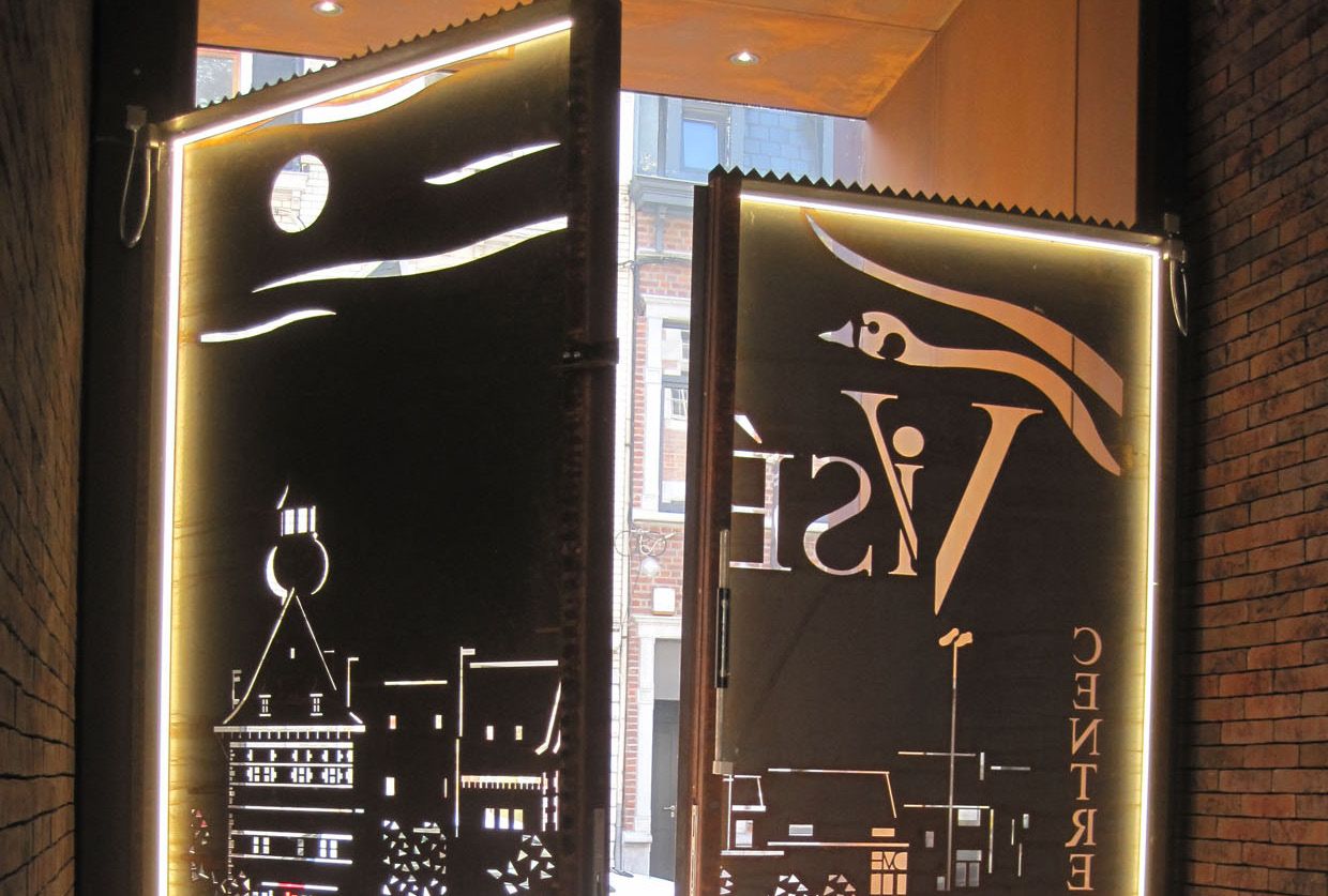 Un porche en acier auto-patinable ('corten') est destiné à matérialiser l’accès du centre culturel de Visé. L’entrée est marquée par un portique monumental aux arrêtes effilées qui se prolonge vers le couloir par un habillage latéral et supérieur en tôlés pliées. L’ensemble des éléments sont fixés de manière invisible. Les parois sont légèrement évasées vers l’extérieur pour accentuer l’effet d’entonnoir. Un écran vient s’intégrer dans le calepinage pour l’annonce des événements culturels. L’entrée intérieure est sécurisée par un double portail en tôle pliée. Un motif emblématique de l’histoire de la ville est découpé dans la tôle. Ce volume apporte une tonalité contemporaine à l’édifice.