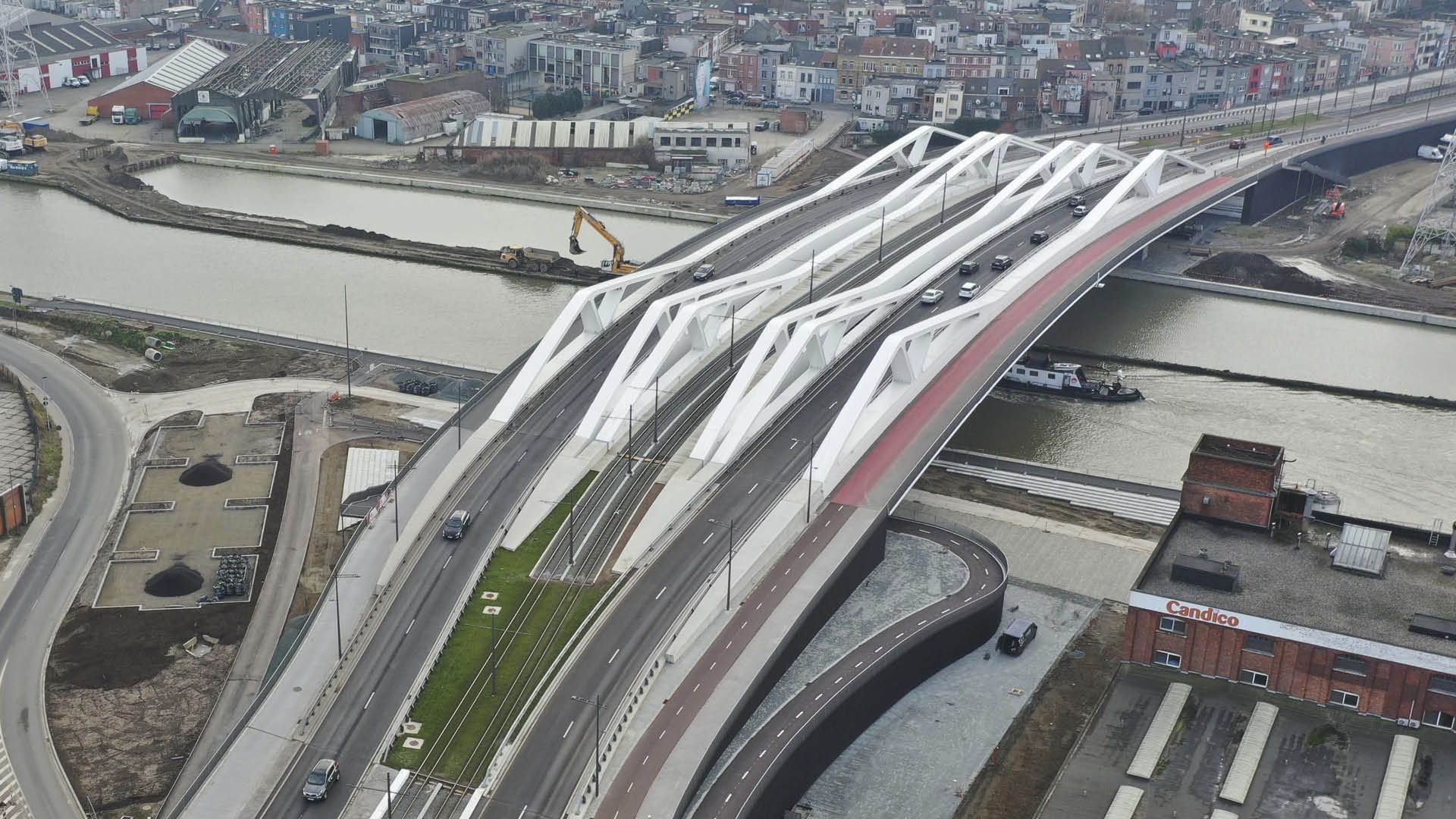Le canal Albert, la voie navigable la plus importante de Flandre, fait l'objet d'améliorations importantes afin d'augmenter sa capacité de navigation fluviale. Dans le cadre du projet ‘Verhogen bruggen Albertkanaal’, un tournant du canal a été élargi à Merksem, Anvers, et son gabarit a été augmenté. Le nouveau pont, composé de trois ponts métalliques adjacents, se distingue par sa sous-structure foncée et sa construction ajourée blanche.