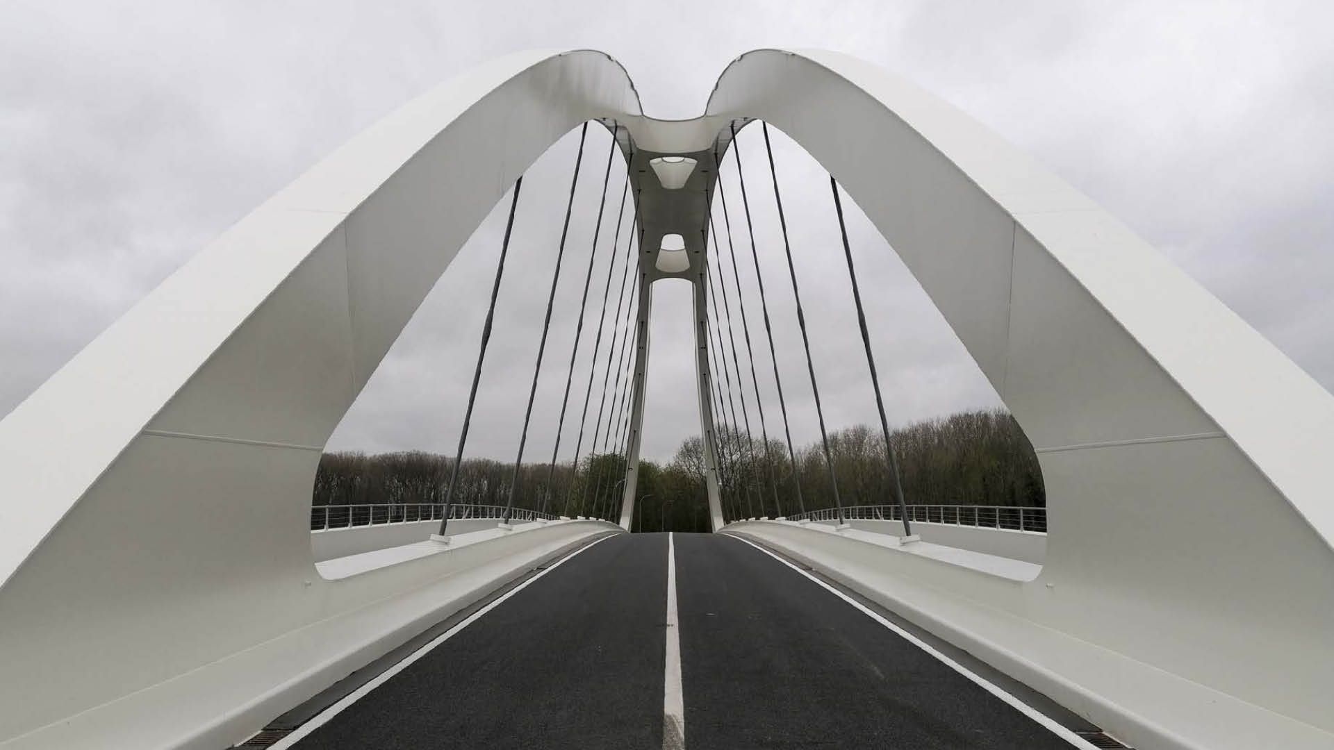 Le pont est un bowstring typique avec des arches inclinées vers l'intérieur et un tablier orthotrope. Il mesure 100 m de long et comporte deux voies pour la circulation routière et, à côté des arcs, en porte-à-faux, des passages pour les piétons et les cyclistes. La conception de ce pont se caractérise par l’encastrement visuel de la connexion des pendentifs dans les arcs.