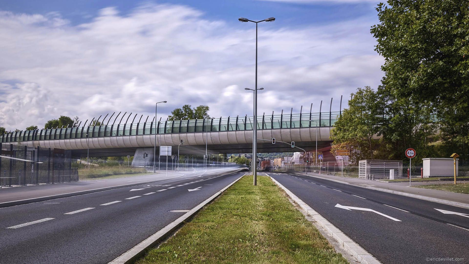 Le pont OA666 au-dessus d'une route d'accès à Raemerich (LU), tel une sorte de "pont-porte", fait partie de l'accès au site de Belval dans le sud du Grand-Duché.