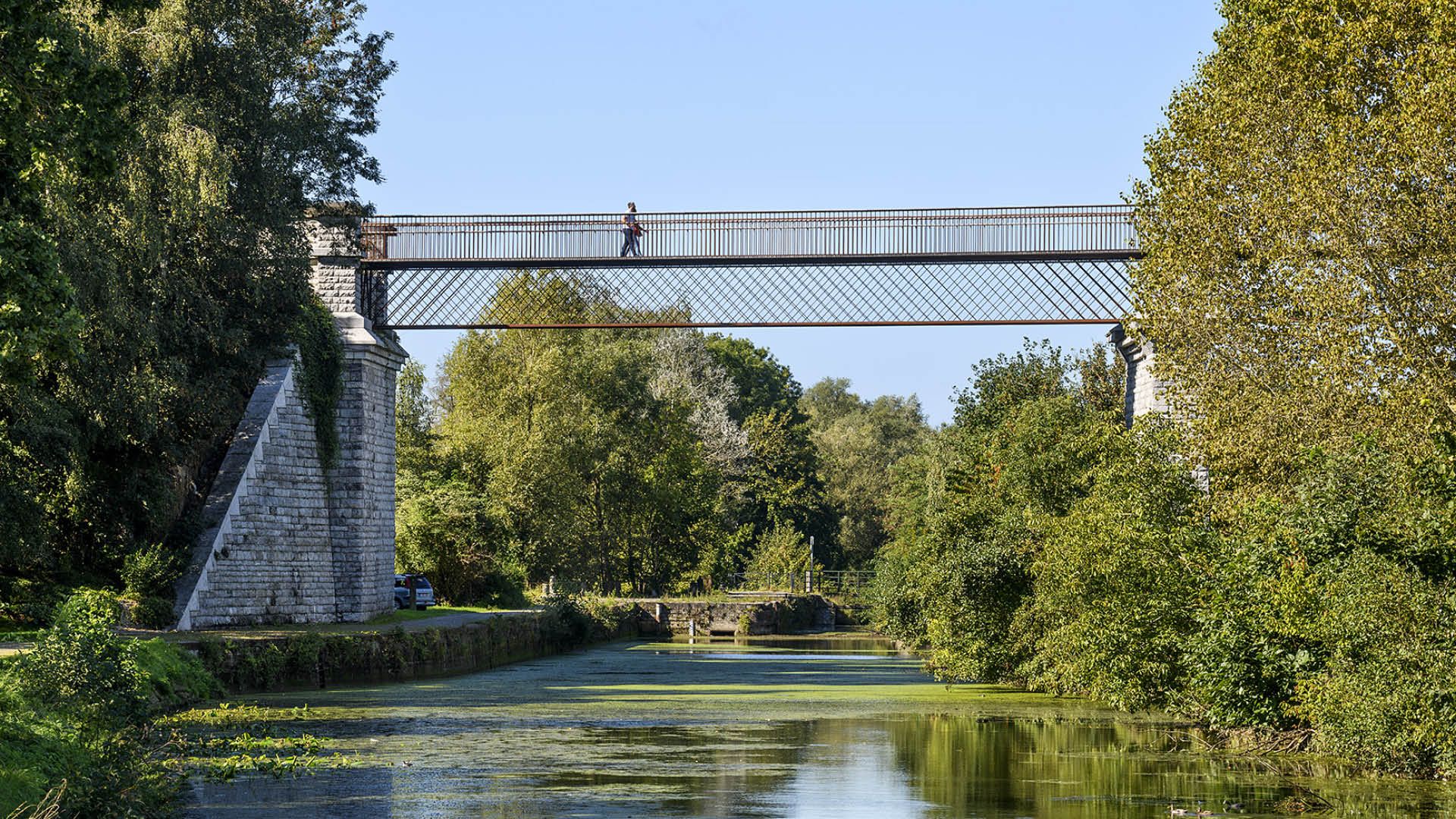 La passerelle d’Arquennes enjambe la Samme et permet de connecter deux tronçons du RAVel 141. (Réseau Autonome de Voies Lentes)