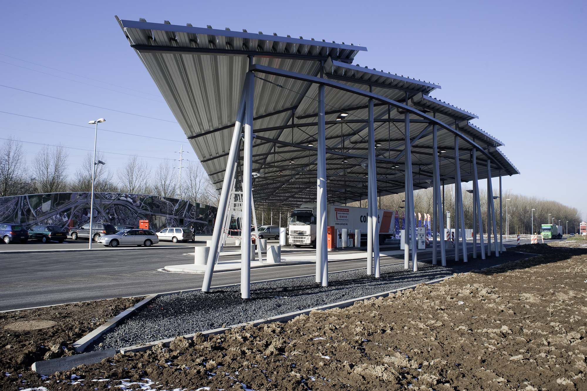 La double station-service de Ruisbroek s’étend symétriquement de part et d’autre de l’autoroute E19, aux portes de Bruxelles. La distribution de carburant est implantée à 45° en correspondance avec l’aménagement paysager du site. Elle est protégée par un auvent en acier à couverture courbe formée de cinq facettes longitudinales en bacs nervurés. La structure effilée est constituée de poutres lenticulaires avec câbles de contreventement supportées par des colonnes tubulaires jumelées. Les façades en panneaux acier de la boutique adjacente sont tapissées de photos aériennes monumentales de la ville de Bruxelles et de sa périphérie. La station Est, à la sortie de Bruxelles, est complétée par un bâtiment restaurant et un distributeur d’hydrogène liquide habillé d’acier déployé galvanisé. La station Ouest, vers l’entrée de la capitale, est annoncée par la façade monumentale d’un hôtel (en construction) implanté comme un pavillon dans un parc.