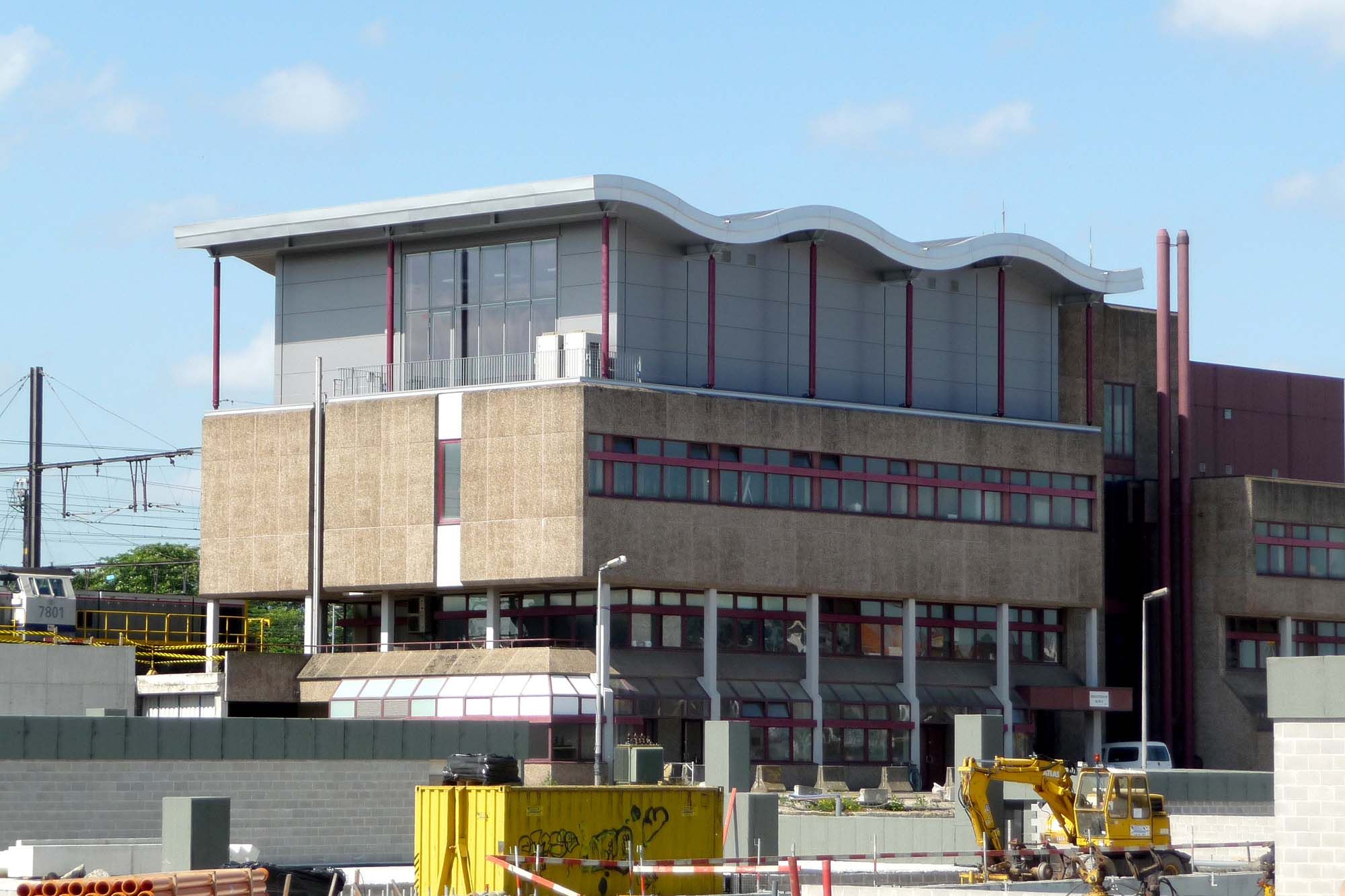 Le poste d’aiguillage de la gare de Gand-Saint-Pierre s’est vu ajouter un étage pour les opérateurs et un espace pour les équipements. La réduction des charges a motivé le choix d’une structure en acier. Le toit plat existant ne pouvait supporter que des forces horizontales. Un treillis de poutres en acier placé sur la totalité de la surface permet de transférer les forces vers les colonnes existantes via des pivots. Les parois reposent sur ces poutres et supportent la charge au vent. Elles sont constituées d’un treillis de profilés creux avec habillage intérieur et extérieur. Le toit est de forme ondulée, soutenu par des colonnes et articulé à son extrémité. La stabilité latérale du toit est assurée par des saillies reposant sur des contreventements intégrés aux parois.