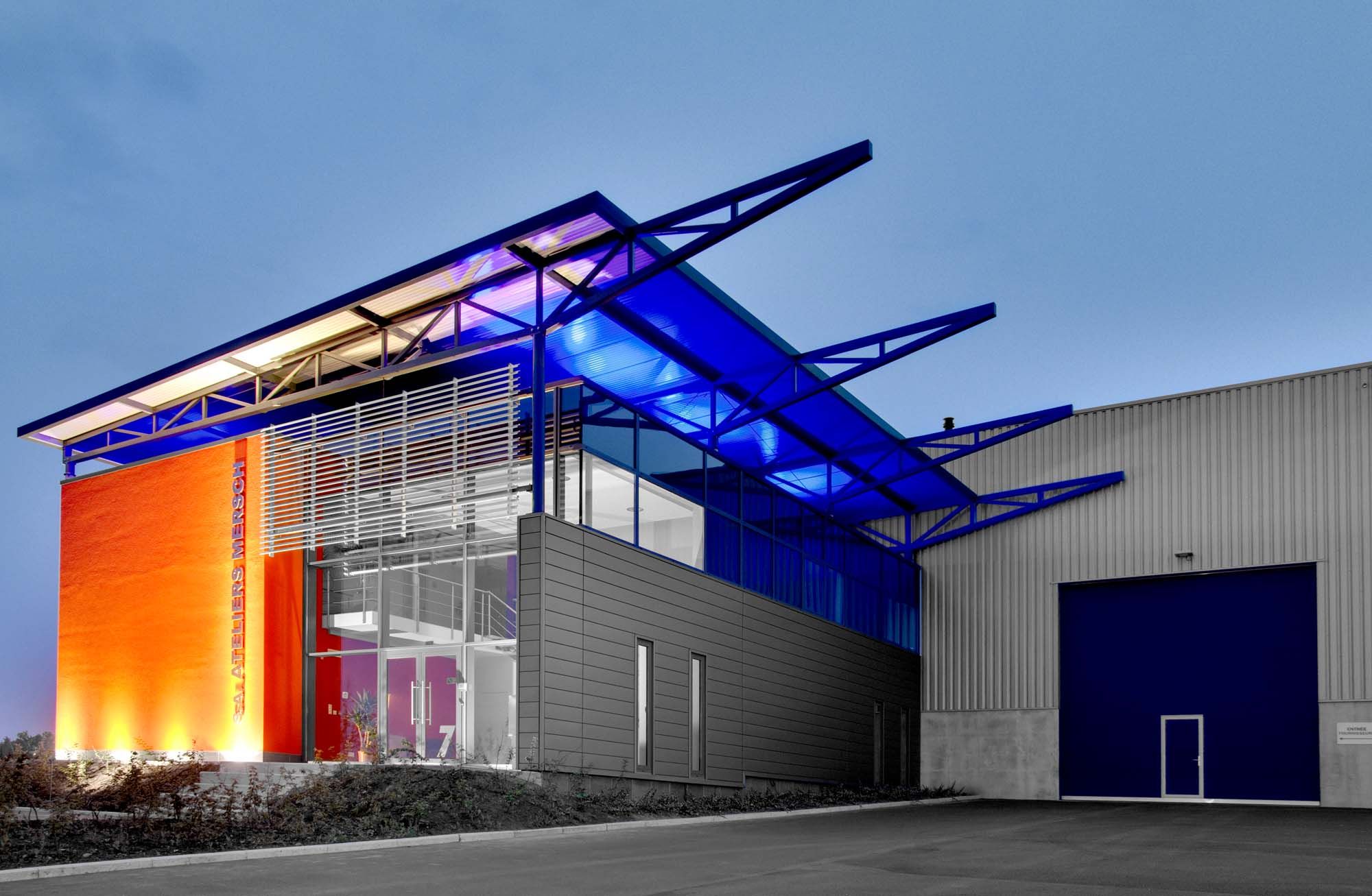 Les bureaux quant à eux sont accolés aux ateliers et représentent une surface utile d’environ 400 m². La structure porteuse est constituée d’une structure mixte avec des poutres et colonnes en acier. La structure de la sur-toiture est réalisée à partir de tubes en acier. La charpente extérieure a été métallisée pour conserver son aspect dans le temps.