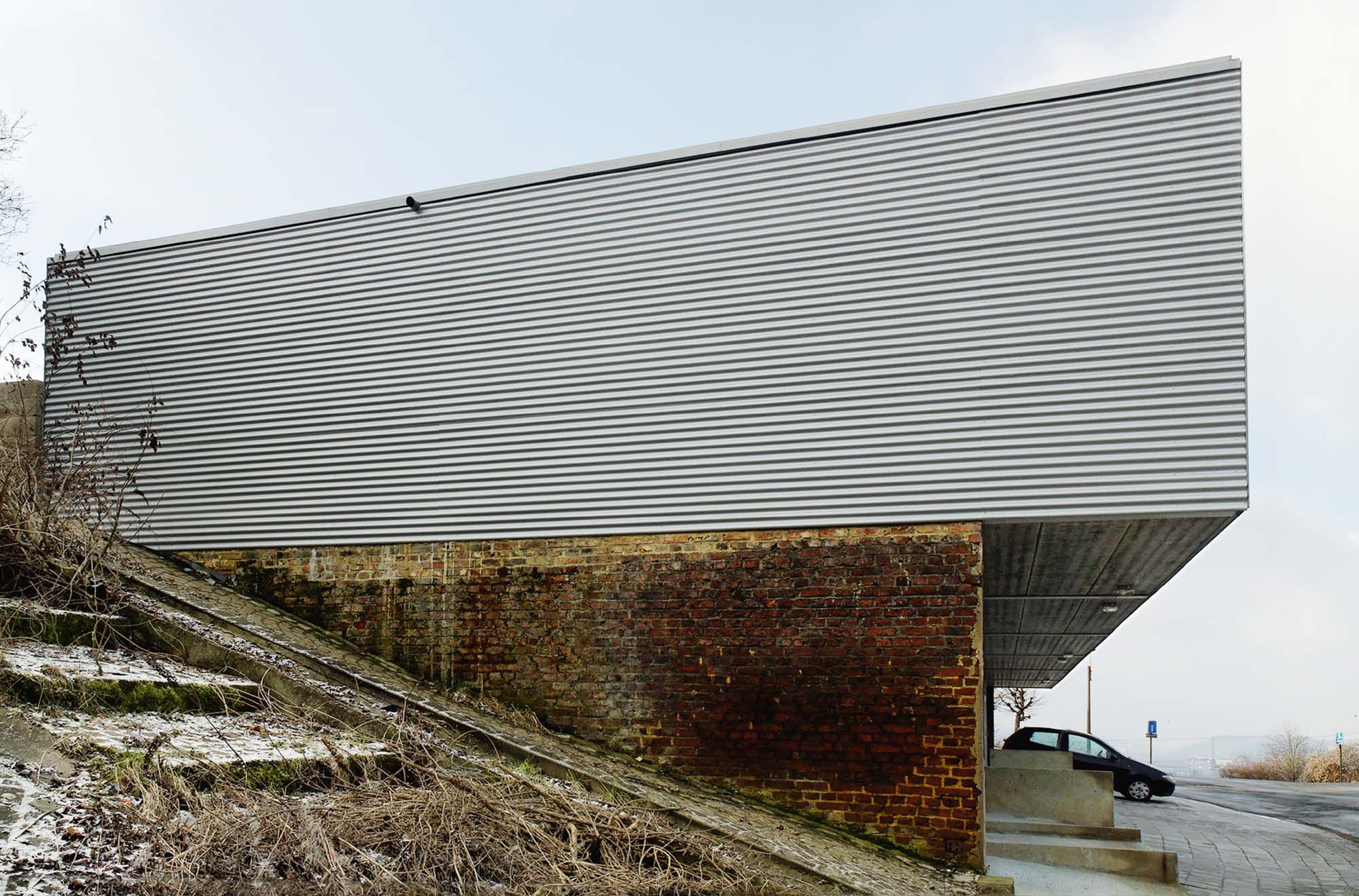 Le programme consiste dans la destruction d’une rangée de six maisons mitoyennes insalubres de la fin du XIXème siècle afin d’y reconstruire trois logements neufs. Le parti permet de résoudre deux problèmes : assurer la stabilité du maintien des terres sans utiliser l’entièreté du budget à reconstruire un mur de soutènement et restituer un impact volumétrique équivalent à celui du volume détruit avec une surface plancher budgétairement réalisable. L’objectif est également d’offrir des logements agréables, avec une relation directe aux jardins via une cour (Sud) et des vues plongeantes sur le paysage. Un bardage métallique élégant confère un aspect de légèreté et de sophistication au projet tout en rappelant l’industrie métallurgique qui constitue le fond du paysage. La structure métallique est composée de portiques en acier se répétant à chaque travée (tout les 4,80 m). Ces portiques sont constitués de trois colonnes, dont deux sont contreventées entre-elles par des tirants, et d’une poutre qui referme le portique.