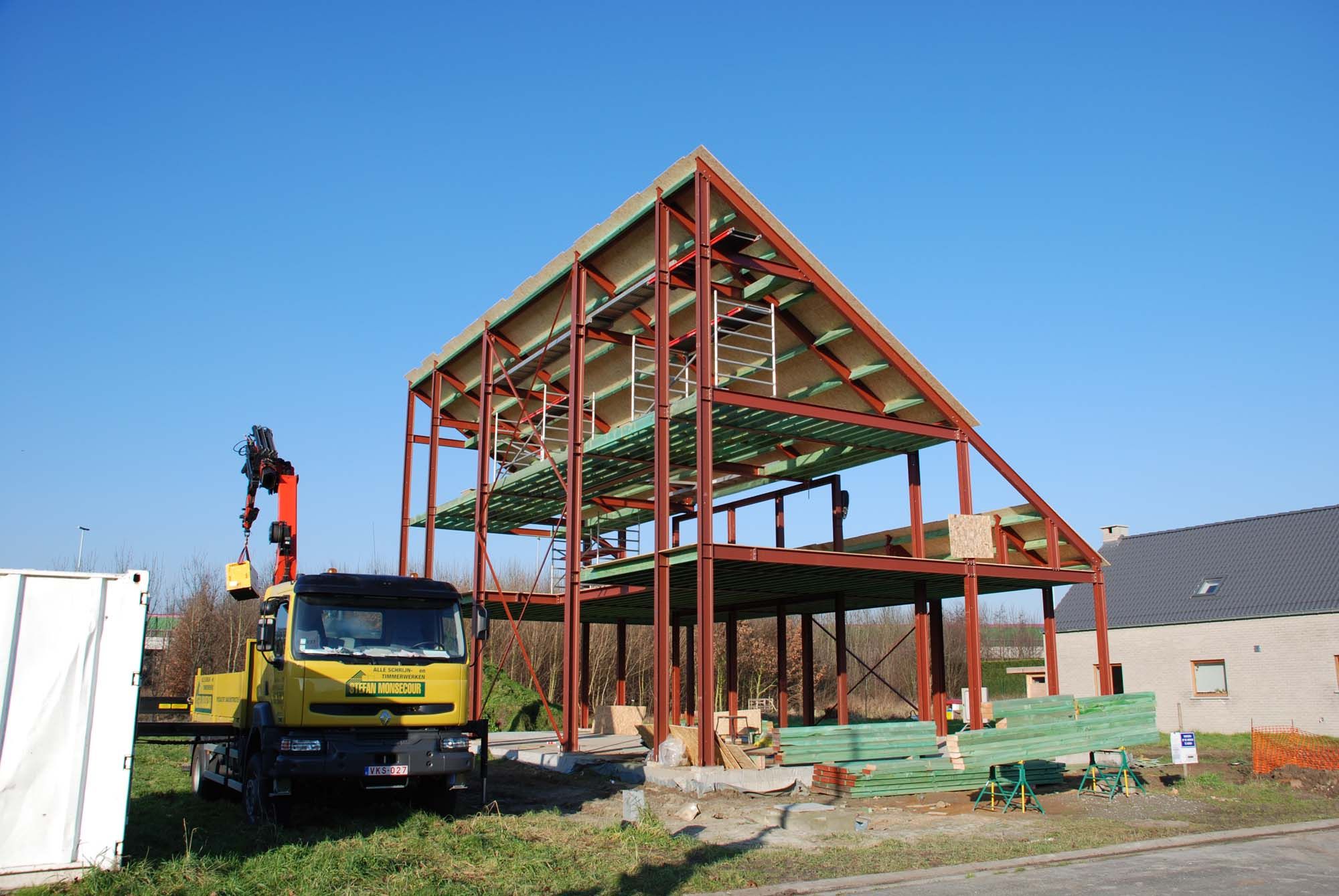 Le squelette en acier remplit le rôle de structure porteuse principale tandis que la méthode avec remplissage en bois assure une rigidité complémentaire à l’ensemble. Ceci permet des économies en poids tout en réalisant une structure principale solide. Les fondations sont ainsi plus légères et on peut bien mieux isoler pour une même épaisseur de mur. L’utilisation d’une structure au lieu de murs et de sols pleins apporte plus de flexibilité dans l’organisation de l’espace et lui permet d’être adapté de manière simple si les conditions de vie venaient à changer dans le futur : une contribution au caractère durable de l’habitation et du bureau.