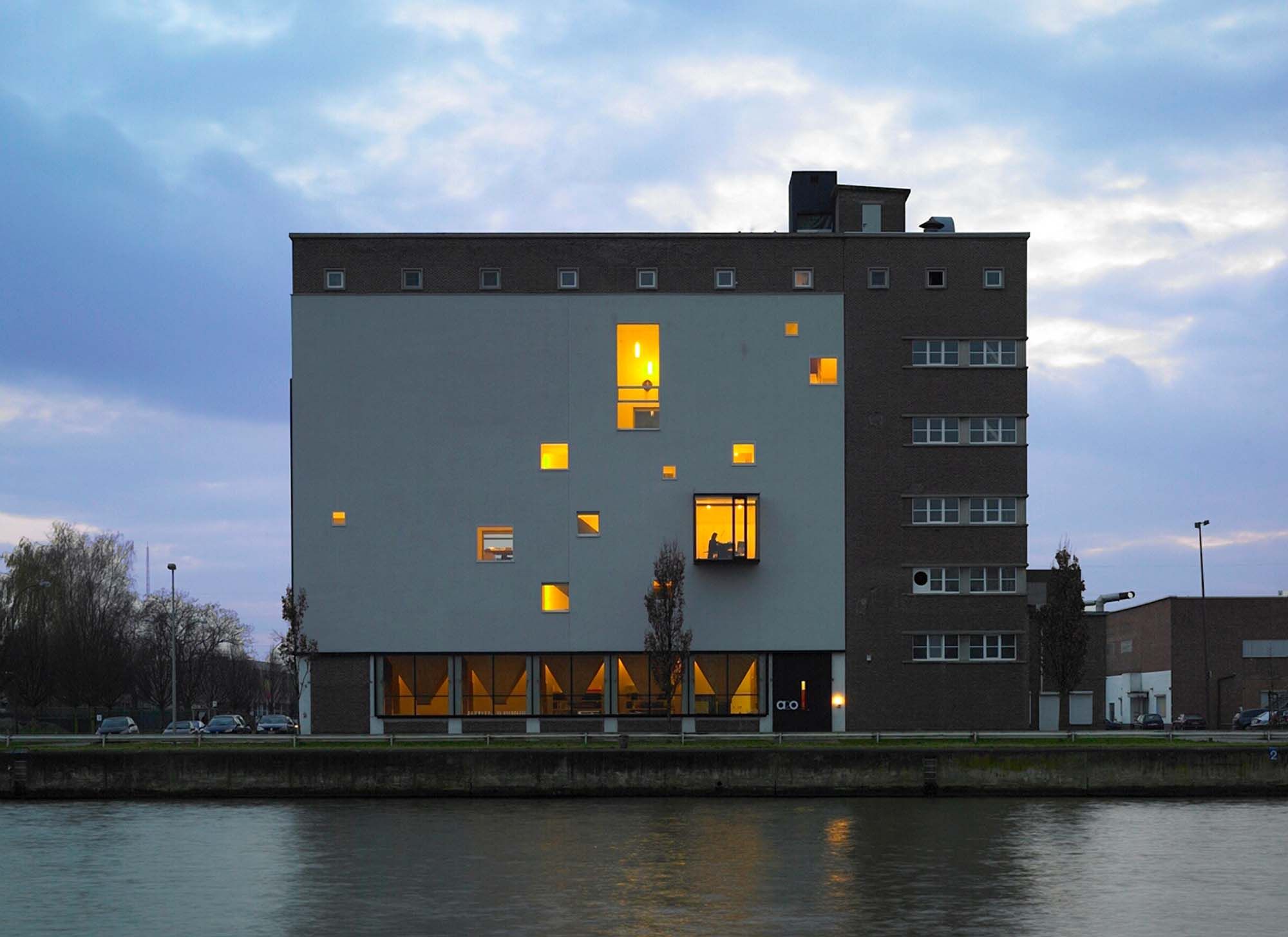 Faire d’un silo de farine un espace de bureaux, telle était la mission de ce bureau d’architectes. L’acier devait jouer un rôle majeur en raison de sa flexibilité et de sa durabilité. Il a été utilisé comme structure d’appui pour les planchers, comme structure temporaire - à réutiliser à chaque niveau - de démontage pour les parois en béton à découper et de montage pour les planchers en hourdis. Tous les nouveaux éléments ont aussi été réalisés en acier, comme les escaliers (suspendus au niveau supérieur) et la loggia caractéristique du côté du canal. Afin de rendre possible l’affectation en bureaux, il a été nécessaire de percer un grand nombre d’ouvertures dans les parois existantes sans compromettre la stabilité du bâtiment, ou influencer négativement le comportement à la déformation. Pour la mise en place des hourdis, des profilés de coin en acier ancrés ont été utilisés.