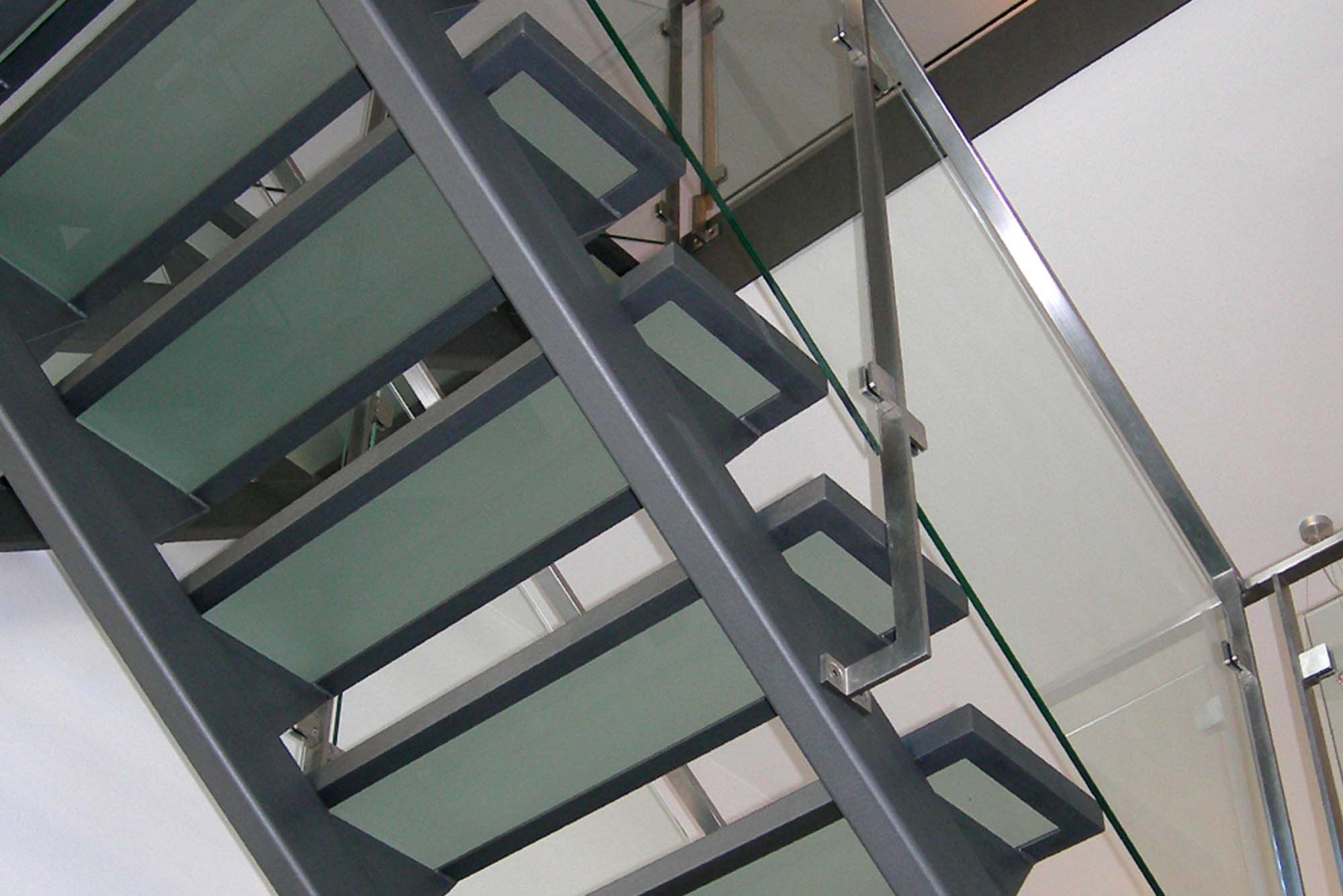 Dans cette nouvelle habitation, les escaliers qui relient les trois niveaux (0, +1, +2) comprennent un limon central et des caissons pour recevoir les marches et palier en verre (30 mm d’épaisseur). La structure de l’escalier est en acier. Le garde-corps est en inox et les panneaux de remplissage en verre. L’acier a été privilégié en raison de ses qualités de solidité et de légèreté. Il a été laqué afin de s’intégrer au style moderne de cette maison où dominent l’inox et le verre.
