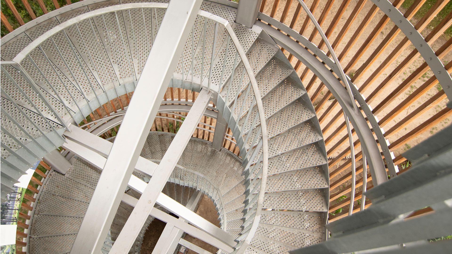 Pour la fabrication de la structure circulaire en acier, d'un poids total de 15 tonnes d'acier S235, un gabarit spécial a été mis au point pour aligner correctement les segments de la tour et rouler et rouler les parties incurvées. La tour a été construite en six segments distincts, une mesure nécessaire pour permettre la galvanisation et le transport vers le site de construction. La structure en acier a été placée sur une fondation en béton, ce qui a contribué à la rigidité et à la stabilité de la tour, en minimisant les mouvements latéraux et les vibrations. L'acier galvanisé et le bois dur durable sont en harmonie avec le paysage.