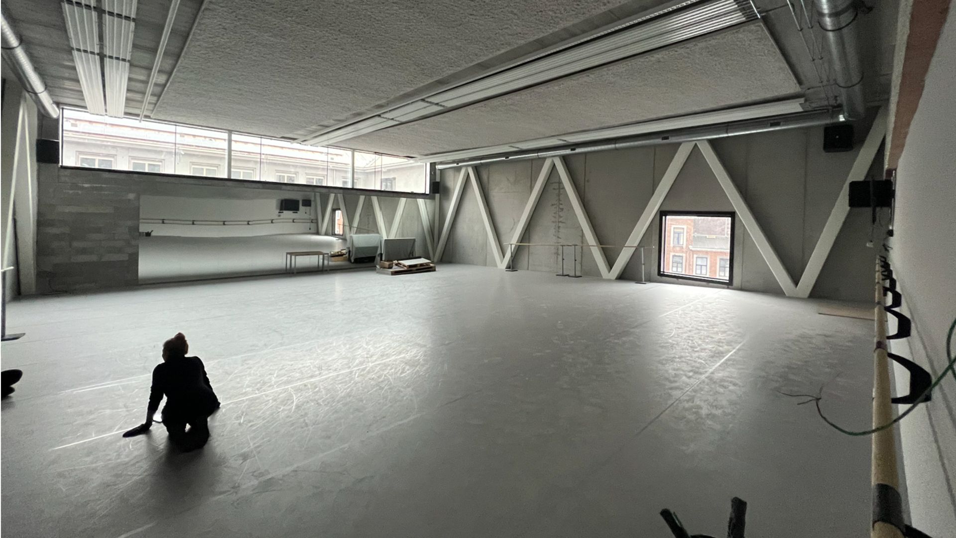 Les interventions majeures concernent la création de 7 plateaux de danse dans un bâtiment existant dense et cloisonné. Les studios, répartis en 3 volumes, viennent délicatement se glisser dans la structure existante. Le choix de l'acier était donc la façon la plus adéquate d'apporter des structures légères au sein même du bâtiment et limiter l'impact de l'intervention sur l'existant mais également de permettre un temps d'intervention réduit. Ces nouvelles structures sont fondées indépendamment de la structure existante afin de garder une autonomie structurelle.