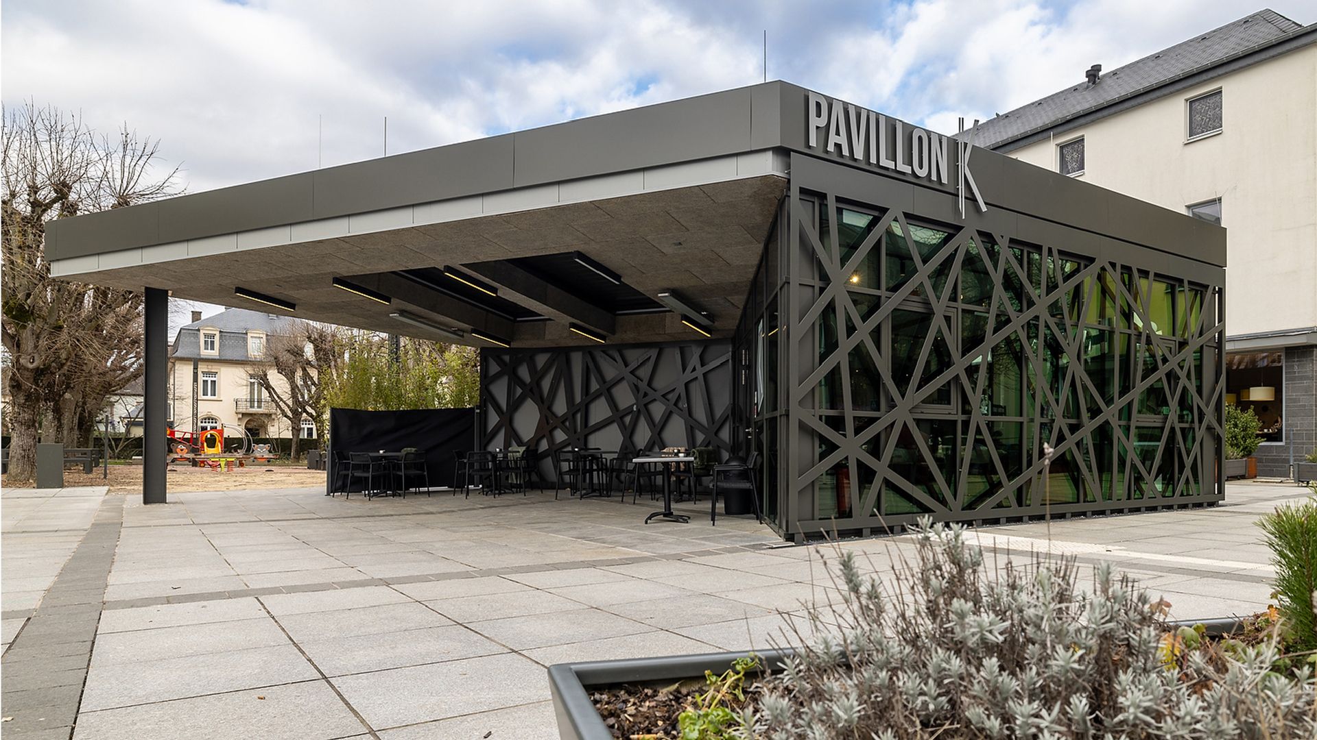 Le 'Pavillon K', avec son design géométrique, rappelle les éléments de mobilier de la place elle-même. Son décors métallique extérieur agit comme un filtre pour un espace intérieur et assure une ambiance agréable et chaleureuse à l'intérieur. L'habillage métallique dissimule la structure composée de panneaux sandwichs et de grandes surfaces vitrées du bistro. Le comptoir est le résultat d'une réflexion cohérente avec les formes géométriques du 'Pavillon K', reprenant le design distinctif de l'extérieur du bâtiment.